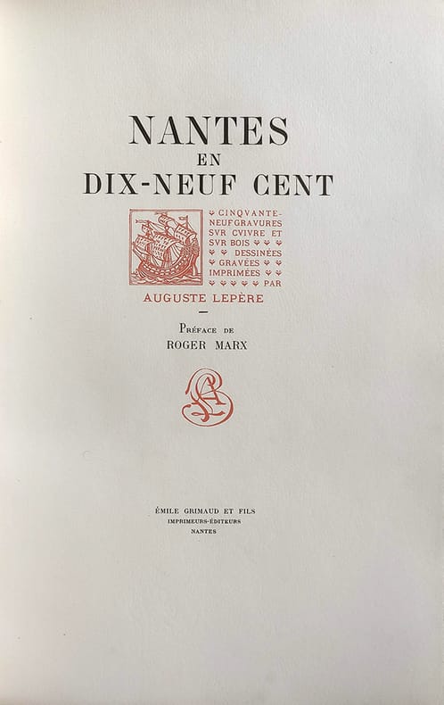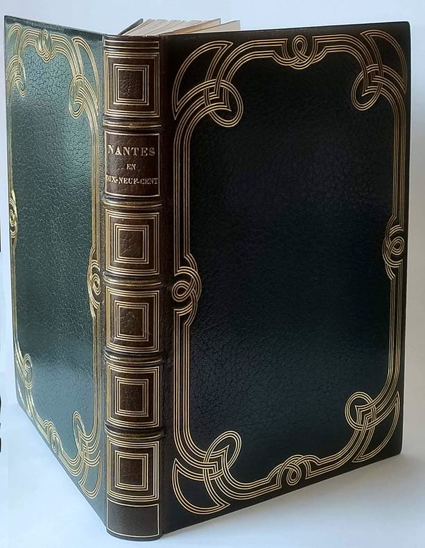 Edition originale illustrée de cinquante-neuf gravures sur cuivre et sur bois d'Auguste Lepère, un des 220 exemplaires numérotés sur pur chiffon d'Arches au filigrane de la ville de Nantes, seul tirage, celui-ci imprimé spécialement pour M. Join-Lambert. Reliure en plein veau fauve, dos à cinq nerfs, date en queue, plats richement ornés d'un large décor de caissons, entrelacs et coquilles mosaïqué de veaux vert, acajou et noir dans le goût Renaissance, contreplats de soie moirée encadrés de sept filets dorés, gardes de la même soie, couvertures et dos conservés, tête dorée, étui aux coiffes frottées et épidermées, reliure Art nouveau signée du monogramme DLR en pied du premier plat. Notre exemplaire est enrichi d'une des planches détruites gravées sur bois faisant partie de la première série "Rue des Barres - Rue Grenier sur l'eau - Sortie de l'exposition" donnéeau musée de Nantes. Rare et très bel exemplaire parfaitement établi dans une élégante reliure à décor Art Nouveau. - Photographies et détails sur www.Edition-Originale.com -