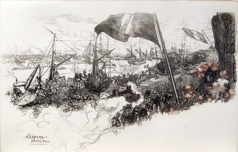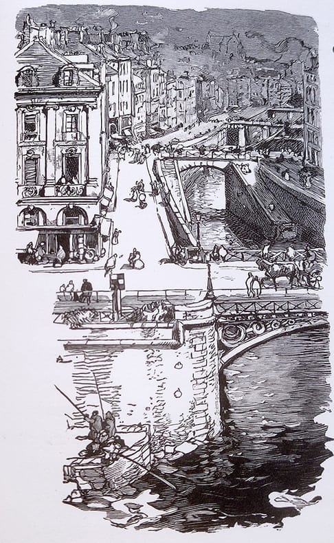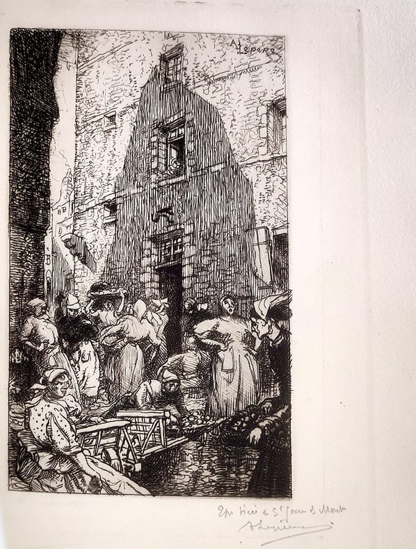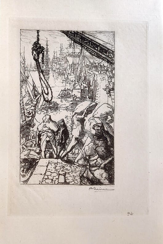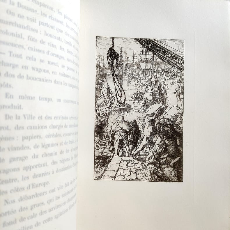 Emile Grimaud et Fils "Nantes et Paris, sans date (Carteret donne 1907 bien que l'achevé d'imprimé soit ) in-4 plein maroquin vert (dos uniformément passé au brun), dos à cinq nerfs, filets dorés formant caissons, plats ornés d'un encadrement de deux triples filets dorés formant un jeu de courbes rappelant des galons de marins, double filet dorés sur les coupes, toutes tranches dorées sur témoins, large encadrement de maroquin sur les plats intérieurs soulignés de filets droits, contreplats et gardes de soie verte. Couvertures de brochage gaufrées conservées. Etui bordée. Reliure signée de Joly fils. Tirage unique à 220 exemplaires, tous sur papier d'Arches spécialement fabriqué pour l'ouvrage et filigrané aux armes de Nantes. L'illustration de Auguste Lepère comprend 4 eaux-fortes hors-texte, une planche mêlant bois et eau-forte et 54 bois gravés (sans compter quelques ornement typographiques). Exemplaire enrichi d'un tirage à part sur vélin de la gravure servant d'en-tête à la préface ""Les quais vus d'un balcon"" mêlant l'eau-forte et le bois gravé, d'un tirage à part sur Chine de la première page de la préface, d'un tirage à part sur Chine du bois ""Ateliers de chaudronnerie, rue de la brasserie"", d'un tirage sur Chine signé en 2ème état de l'eau-forte ""Le port"", d'un tirage sur Chine signé en 2ème état et sur vélin (avec mention : Epreuve tirée à Saint Jean de Mont) de l'eau-forte ""Impasse Gaudine / Marchandes de poires cuites"", de tirages sur vélin signé de la première planche et du dernier état de l'eau-forte ""Kermesse au jardin des plantes"", du spécimen-prospectus illustré de deux bois gravés et tiré à 350 exemplaires numérotés (4pp.) Imprimé à Nantes sur les presses d'Emile Grimaud et fils pour le texte le 30 juillet 1900, à Paris sur les presses à bras d'Auguste Lepère et sous sa direction pour les gravures le 30 novembre 1900. Emile Fequet pressier. Carteret IV-302 ""Belle publication très cotée"" / Mahé, Bibliographie des livres de luxe T.III p.3. Auguste Lepère (Paris 1849-Domme 1918), peintre, illustrateur et graveur débute sa carrière comme simple graveur pour les journaux illustré (avant que la photogravure ne vienne remplacer définitivement la gravure sur bois d'illustration). Pour l'édition, il grave d'abord d'après les dessins de Morin ou Daniel Vierge avant de graver ses propres dessins. Amoureux du vieux Paris, du Paris populaire, du monde ouvrier, il est choisi pour illustrer les ouvrages de luxe ayant trait à cette thématique : on lui doit ainsi la mise en images des Paysages parisiens d'Emile Goudeau (1892), du Paris au hasard de Montorgueil (1895), des Dimanches parisiens de Morin (1898) ou des Paysages et coins de rue de Richepin (1900). Robert Joly (né en 1878) est le fils du relieur et doreur Antoine Joly. Les reliures exécutées par Robert Joly pour Henri Vever, « d’une richesse splendide et d’une perfection d’exécution remarquable, figurent parmi les plus belles de l’importante bibliothèque de ce grand amateur », estime Crauzat dans La reliure de 1900 à 1925."