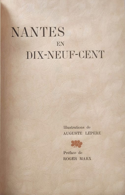 Nantes Reflets du Passé R. et M. VIVANT 1984 in-8 demi skivertex un volume, reliure demi skivertex chocolat grand in-octavo à coins Editeur (27,7 x 18,6 cm), dos aux armes de nantes ("or" et rouge), fleurs de lys et hermines dorées dans un encadrement d'un double filet "or", plats décorés d'un filet doré aux mors et aux coins, papier fantaisie vert marron et or aux plats, toutes tranches lisses, édition numérotée sur papier centaure ivoire 170g, tirage limité à 1050 Exemplaires (N°813), impression en deux couleurs (rouge et noir), 59 illustrations in et hors-texte en noir par Auguste LEPÈRE, (13) + 133 pages, 1984 Nantes Reflets du Passé R. et M. VIVANT Editeurs,