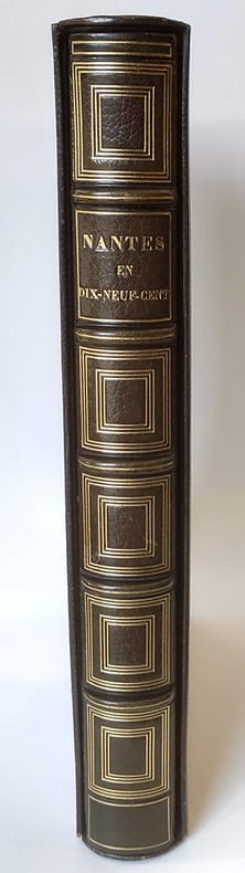 nantes Reflets du Passé 1984 -in-8 demi- simili maroquin un volume, reliure demi- simili maroquin chocolat grand in-octavo à coins (binding half simili morocco with corners in-8 Editor), dos long (spine without raised bands), décoré "or" et orange (plaques spéciales editeur), titre "or", décoration de semis de fleurs de lys et d'hermines avec armes de la Ville de Nantes, plats décorés "or" d'un filet doré aux mors et aux coins, toutes tranches lisses, Tirage Unique à 1050 exemplaires (N°383), titre en rouge et noir, orné de 59 gravures sur cuivre et sur bois en noir par Auguste Lepère, ( 14)+( titre)+(7) +133 pages, 1984 Nantes, Reflets du Passé, R. et M. Vivant, éditeurs ( réimpression de l'édition de Nantes, Grimaud, 1900),