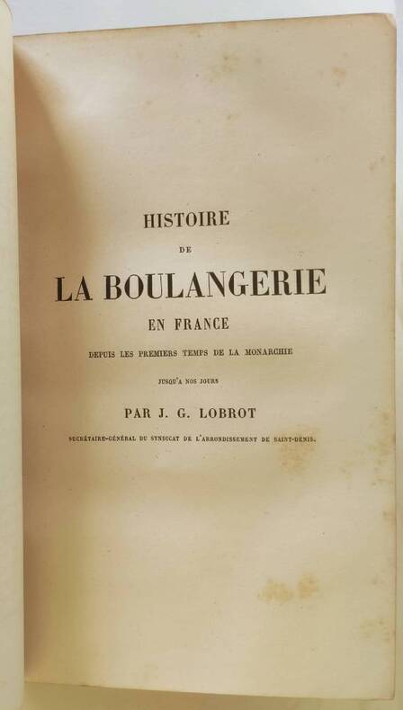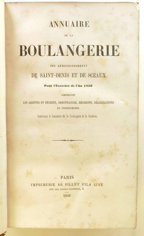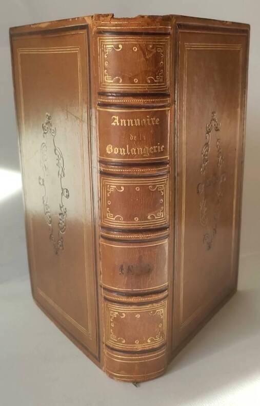 Imprimerie de Pillet fils ainé "Paris, 1856, in-8 plein veau blond, dos à quatre faux-nerfs, plats encadrés de filets dorés et à froid, grand fer à froid au centre des plats. Dentelle intérieure. Toutes tranches dorées. 495pp. Y compris faux-titre et titre. Contient une Histoire de la boulangerie en France depuis les premiers temps de la Monarchie jusqu'à nos jours par J. G. Lobrot, secrétaire général du syndicat de l'arrondissement de Saint-Denis (pp.51 à 287). L'ouvrage qui s'ouvre sur un calendrier contient en outre arrêtés et décrets, ordonnances, décisions, délibérations et instructions concernant le commerce de la boulangerie par le gouvernement, la préfecture de police, la préfecture de la Seine, , les deux syndicats, les tableaux des boulangers classés par commune. Hippolyte Blanc ""Bibliographie des corporations ouvrières"" p.84 N° 1021 ""Les chapitres IX à XIII traitent des anciennes communautés de boulangers."" Petit manque en coiffe de tête, mors du premier plat fendillé sur quelques centimètres, quelques rousseurs. Bon exemplaire de la première année de cet annuaire qui semble n'avoir eu que quatre années d'existence (1856-1859). Absent d'Oberlé et de Vicaire."