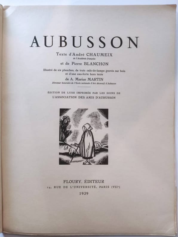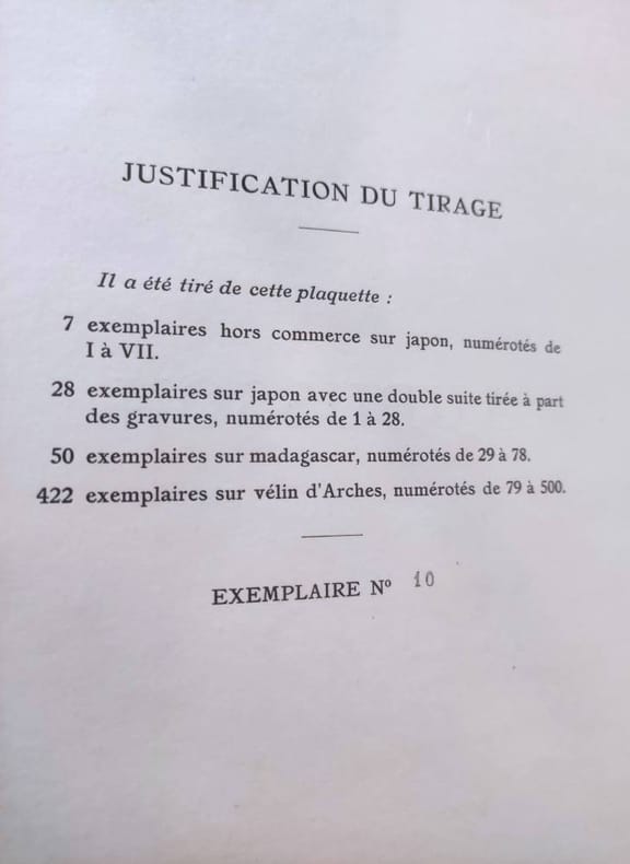 Floury, Editeur Paris, 1939, petit in-folio broché, couverture rempliée illustrée d'une vignette gravée sur bois en noir. 19pp.-2ff. Texte d'André chaumeix et de pierre Blanchon. Illustré de six planches, de trois clus-de-lampe gravés sur bois et d'une eau-forte hors-texte. Tirage à 507 exemplaires, celui-ci est un des 28 exemplaires sur Japon avec une double suite des gravures tirées à part, tirage de tête. Parfait état.