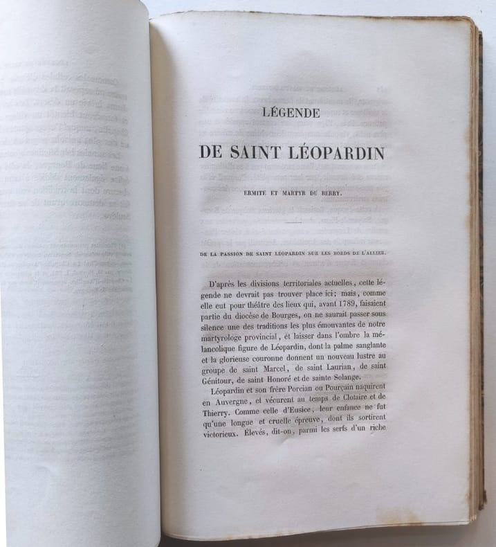 Légendes et vies des saints ou bienheureux Ursin, Léocade, Ludre, Silvestre, Rodène, Laurian, Eusice, Romble, Jacques, Léopardin, Phalier, Patrocle,Austrégisile, Sulpice-Pieux, Guillaume, Honoré, Josbert, Robert Arbrissel, et Sainte Solange, Notre-Dame- de -Vaudouant, Notre-Dame-de-Déols, Jeanne de Valois, etc. Quelques rares rousseurs, coins émoussés. Bon exemplaire.( CH1)