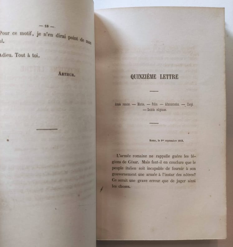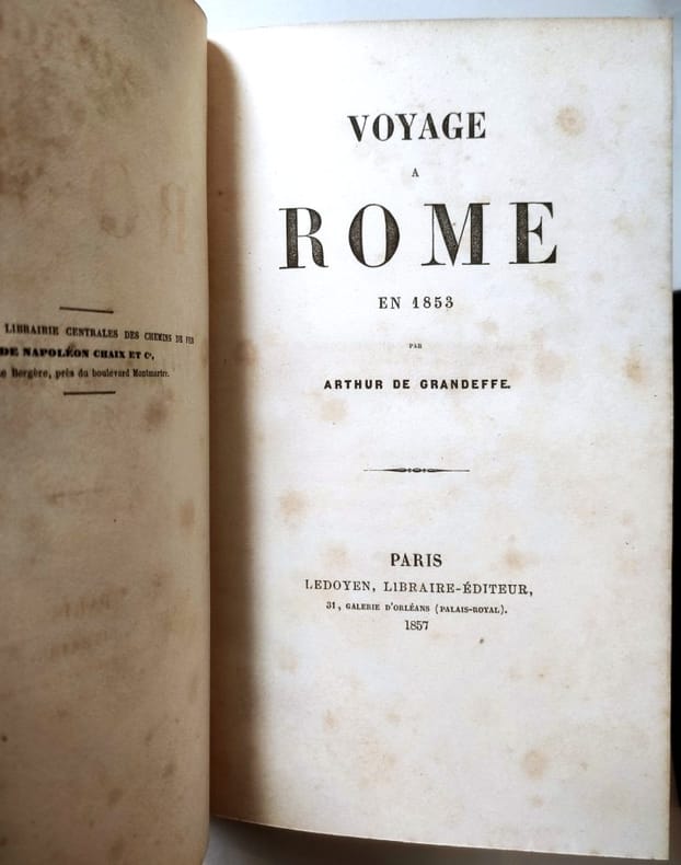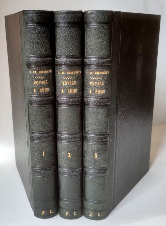 Ledoyen Libraire-Editeur Paris, 1857, 3 vol. in-8 demi-chagrin vert sombre dos à quatre nerfs, initiales F.L. dorées en queue. Reliure de l'époque (J.J. Lespous à Mont de Marsan) T.I 3fff.-XXXIpp.-249pp.-1f. D'errata / T.II 2ff.-285pp. / T.III 2ff.-280pp.-1f. D'errata. Voyage critique, philosophique, artistique et anecdotique. Description des mœurs, coutumes, usages, mystères, cérémonies religieuses et monuments de la ville de Rome. Edition originale. Arthur, Armand, Raoul, comte de Guilloteau de Grandeffe (1832-1900) était avocat, homme de lettre et linguiste. Très bon exemplaire. Rares rousseurs.