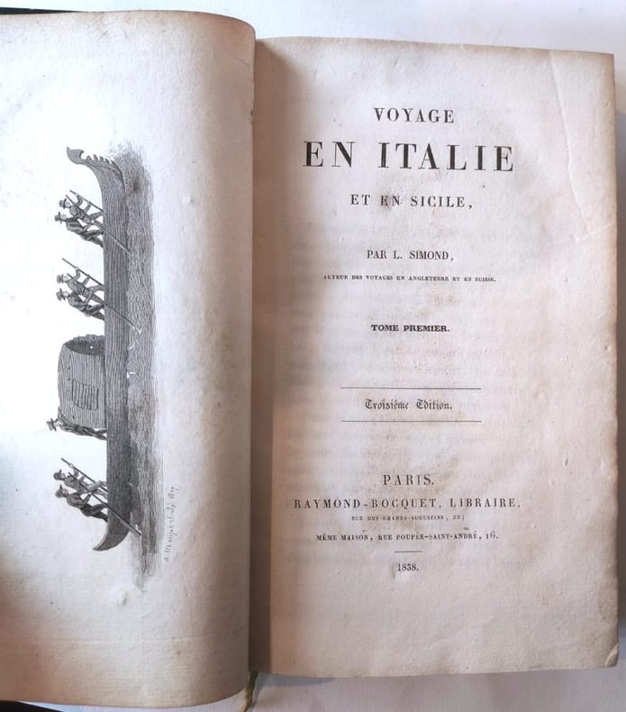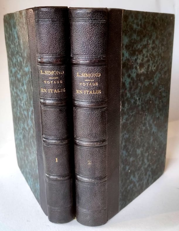 A. Sautelet Et Compagnie Paris 1828 2 volumes grands in-12 demi basane verte.Dos à 4 nerfs. Titre et tomaison dorés.Larges guirlandes dorées en tête et queue.Fleurons dorés entre-nerfs, filets perlés dorés soulignants les nerfs. Roulette à froid sur nerfs.Tranches marbrées.Par l'auteur des voyages en Angleterre et en Suisse.Tome 1. 405 pages.1 gravure hors texte et un tableau.Iles Borromées, Cathédrale de Milan, Fore Buanaparte, Milan, Vicenza, Padoue, Venise, Opéra, Palais Ducal, Doge, Pô, Les morts, L'Inquisition, Moeurs, Appenin, Raphaël, Fabbroni, Val d'Arno, Mendiants, Perugia, Terni, Assassins, St Pierre, Capitole, Colysée, Mont Palatin, Thermes Titus, Caracalla, Obélisque égyptien, Vatican, Michel Ange, Voleurs grd chemin, Bonaparte, Mariage, Ile du Tibre, Carnaval, etc.Tome 2 et dernier. 420 pages.1 gravure hors-texte et 1 dessin in-texte.Caere, Origine de Rome, 1ers romains, Latium, Mal'Aria, Borghèse, Adriana, Semaine sainte, rerracina, Capoue, Baie de Naples, Moeurs, Pompeia, Portici, Vésuve, Moeurs, Pzzuolo, Baïa, Gouvernement, Paquebot, Navigation, Instruction, Moeurs, Monte Reale, Segeste, Selimonte, Alicata, Chiara monte, Syracuse, Etna, Catane, La Sicile, Agriculture, Salerne, Pompeia, Mont Cassin, Montone, Anagni, Pise, Massa Carrara, Gênes, Sardaigne, Turin, Suze, Mont Cénis, Savoyards.Table alphabétique.Très bel exemplaire.