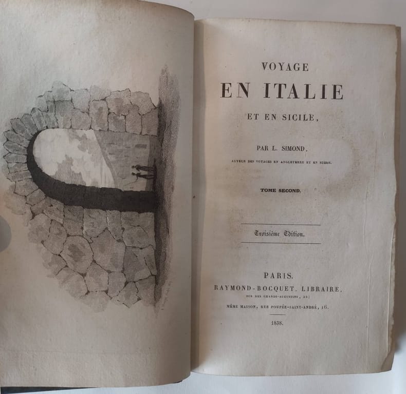 Edition originale, illustrée de 2 figures in-texte et deux hors-texte (répétés), ainsi que d'un tableau (mouvement de la population dans la ville de Rome). Reliure en demi veau glacé noisette d'époque. Dos à faux nerfs orné de filets gras et maigres, à froid et à chaud, roulette en queue et tête. Pièce de titre de chagrin noir. Traces de frottements. Brunissures éparses, notamment en page de titre, puis essentiellement dans les marges, mais de manière erratique. Un petit manque au mors inférieur en queue. Bel exemplaire. Voyage qui commence au lac majeur de Duomo d'Ossola, petite ville sur la frontière italienne en 1817 et s'achève en 1818 à Suze, près de Turin. Outre l'intérêt du voyage en Sicile et sur l'Etna, à Pompéi et Herculanum, l'ensemble du voyage brille de certaines résonnances politiques, puisqu'il fut fait au lendemain de l'Empire et à l'aube des révolutions italiennes. Nombreuses descriptions en rapport aux beaux-arts, intérêt pour le pittoresque et l'anecdote (chapitre sur les mendiants et les voleurs de grand chemin en Italie). - Photographies et détails sur www.Edition-Originale.com -