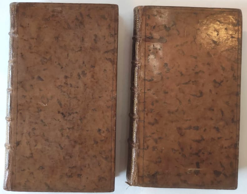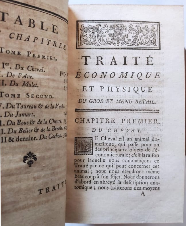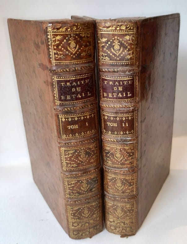chez J. Fr. Bastien Paris, 1778, 2 vol. in-12 plein veau de l'époque, dos à cinq nerf très orné, pièces de titre de maroquin rouge, tranches rouges. 2ff.-XIIpp.-544pp. / 2ff.-488pp.-2ff. De privilège. Edition originale de cet ouvrage relatif aux animaux de la ferme et à la médecine vétérinaire. Bel exemplaire en fraîche reliure de l'époque.
