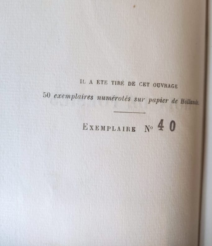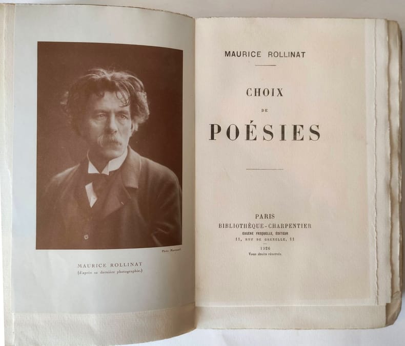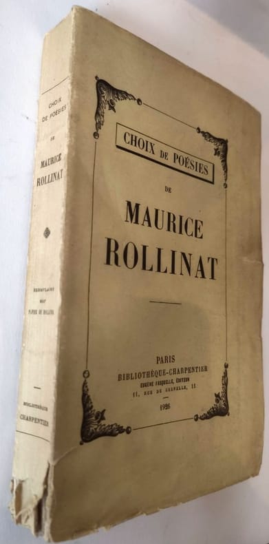 Bibliothèque Charpentier / Eugène Fasquelle Editeur Paris, 1926, in-12 broché à toutes marges, 284pp. Portrait frontispice d'après la dernière photographie de Maurice Rollinat. Un des 50 exemplaires numérotés sur papier de Hollande, seul grand papier annoncé. Petites déchirures en bord des couvertures, petits manques de papier en queue. Intérieur en très bon état. Les poèmes choisis sont issus de tous les recueils de Rollinat : Dans les brandes, Les névroses, L'abîme, La nature, Les apparitions, Paysages et paysans, Les Bêtes, Fin d'œuvre. Edition originale collective sur grand papier.