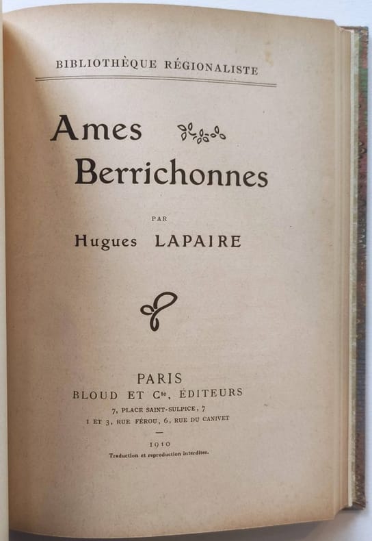 Bloud et Cie Paris, 1908, deux ouvrages reliés en un petit in-8 demi-chagrin à nerfs moderne, plats de couvertures conservés. Le pays berrichon, illustrations de Jean Baffier, Armand Beauvais et Fernand Maillaud, 117pp.-2ff. envoi autographe de Lapaire sur le premier titre au sculpteur Jean Baffier. / Âmes berrichonnes, 1910, 3ff.-101pp.-1f. Reliure moderne de bonne facture, dos légèrement éclairci.