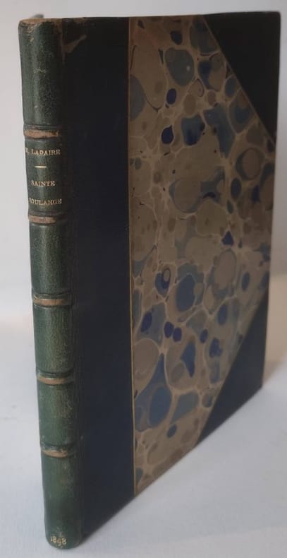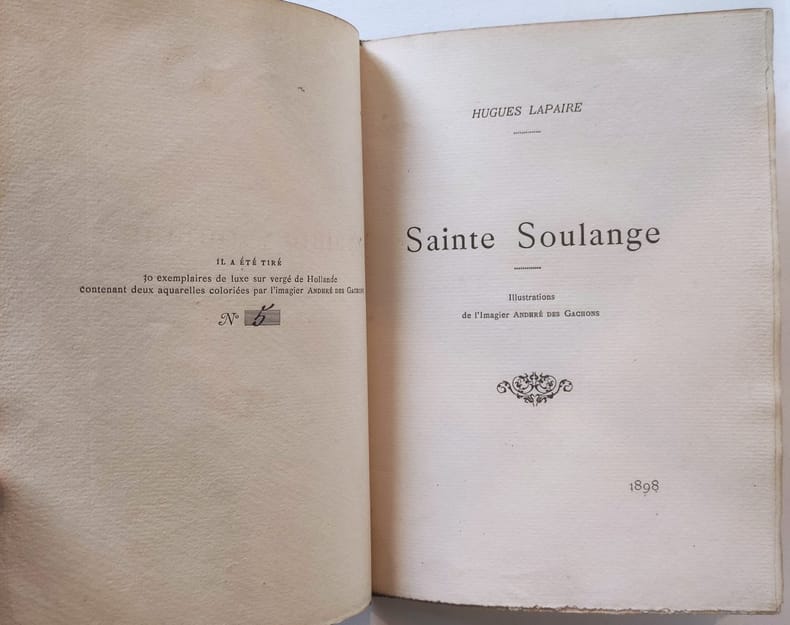 Edition originale, avec un envoi autographe de l'auteur à Théodore Botrel. Sainte Solange est l'une des deux patronnes du Berry à laquelle Lapaire et Gachons (tous les deux berrichons également) rendent ici hommage. Le premier avec le récit en patois et en vers de l'histoire de la sainte décapitée pour ne pas avoir voulu se marier avec le fils du comte de Poitiers, le second par trois belles aquarelles dans le goût art nouveau et la reproduction d'un de ses tableaux montrant la sainte touchée par la grâce au milieu de la forêt.