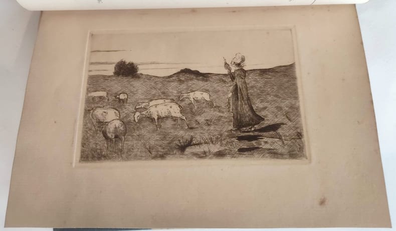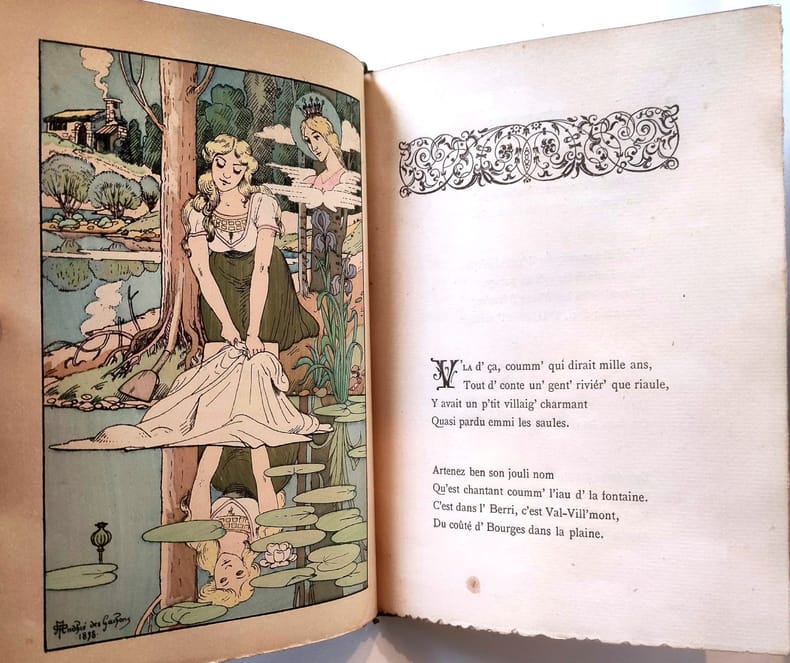 Crépin-Leblond Moulins, 1898, in-8 carré, demi-chagrin bleu à coins, dos à nerfs, tête dorée, date en queue. Reliure de l'époque. Edition originale illustrée par Andhré des Gachons de 4 compositions hors-texte dont une eau-forte originale et deux planches mises en couleurs par l'artiste. Un des 30 exemplaires numérotés sur vergé de Hollande. Le premier plat de couverture illustré a mystérieusement été retiré.