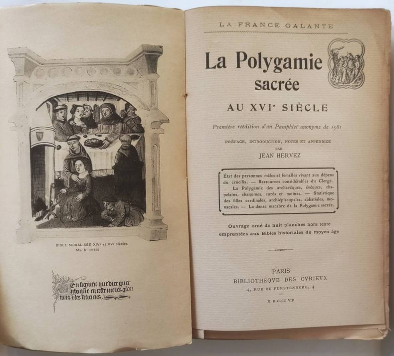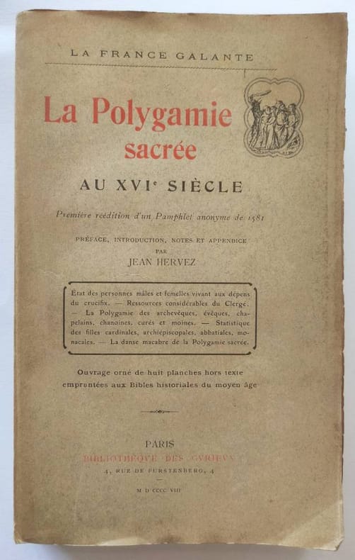 Bibliothèque des curieux Paris, 1908, coll. La France Galante, in-8 broché, 312pp. dont XXXIIIpp. d'introduction. Préface, introduction, notes et appendice par Jean Hervez. Ouvrage orné de huit planches hors-texte empruntées aux Bibles historiales du moyen age. Comprend : Etat des personnes mâles et femelles vivant au dépens du crucifix / Ressources considérables du clergé / la polygamie des archevêques, évêques chapelains, chanoines, curés et moines / statistiquedes filles cardinales, archiépisciopales, abbatiales, monacales / la danse macabre de la Polygamie sacrée. Très bon état.