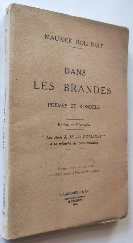 Laboureur et Cie "Issoudun, 1946, in-12 broché, 167pp. Réédition par les ""amis de Maurice Rolinat"" du premier ouvrage de l'auteur pour le centenaire de sa naissance. Dans les brandes, publié en 1877 et dédié à George Sand dont le père de Rollinat était proche, ne connu aucun succès malgré le parrainage de l'illustre dame de Nohant. Maurice Rollinat, Chateauroux 1846-Yvri sur Seine 1903. Exemplaire numéroté 27 à la presse. Tout petit manque en haut du dos."