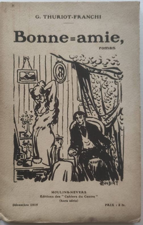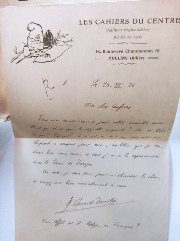 Editions des cahiers du Centre Moulins-Nevers, 1919, in-12 broché, couverture illustrée d'un bois gravé, 52pp.-2ff. Georges Thuriot-Franchi (1890-1956) fut poète et employé des postes de Nevers. Edition originale enrichi d'un envoi autographe de l'auteur et d'une lettre autographe de Henri Buriot-Darsiles (1875-1944) à l'en-tête des Cahiers du Centre, à Moulins et datée de 1926. Il y est question d'un ex-libris. Henri Buriot-Darsiles écrivit plusieurs numéros spéciaux sur le sujet des ex-libris dans Les Cahiers du Centre. Sa germanophilie (il fut professeur d'allemand à Moulins et donna une traduction du Werther de Goethe) lui valut d'être sommairement exécutée par un groupe non identifié de résistants le 7 septembre 1944 sur les bords de l'Allier.