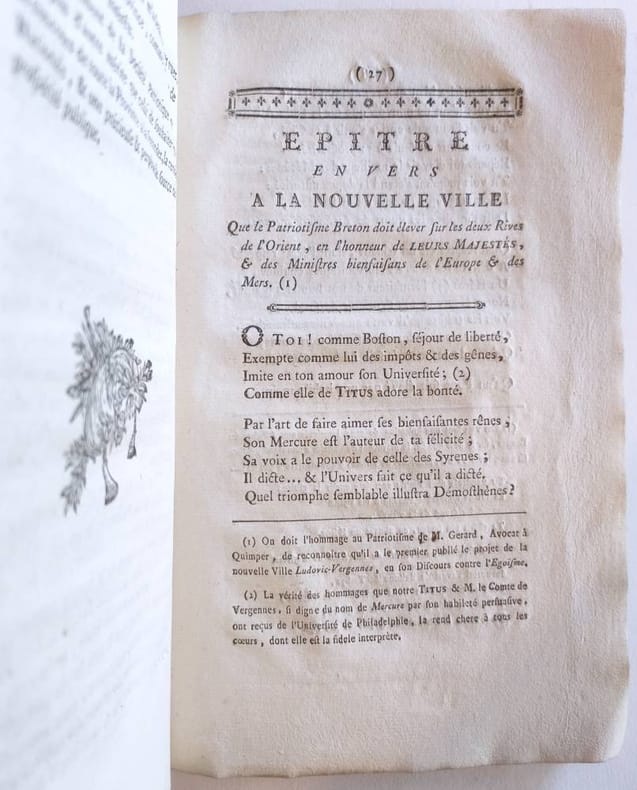 De l'imprimerie de L.J. Prud'Homme, Imprimeur-Libraire, Place du Martrai "Saint-Brieuc, 1785, plaquette in-12 broché, couverture d'attente de papier coquille. 38pp. A la page 27 débute une ""Epitre en vers à la nouvelle ville que le patriotisme Breton doit élever sur les deux rives de L'Orient…"" qui commence par ces vers ""O Toi ! Comme Boston, séjour de liberté / Exempte comme lui des impots & des gênes"". Edition originale de cette plaquette très rare. Barthélémy-Pélage Georgelin du Cosquer (Corlay 1740-Guigamp 1797) fut reçu comme avocat à Rennes en 1762 et sénéchal de Corlay, le dernier à occuper cette charge.Il fut élu membre correspondant de la Société Royale d’Agriculture en 1778, et devint secrétaire général de la Société patriotique de Bretagne de 1780 à 1789. Ses accointances avec le milieu intellectuel le poussèrent à entretenir une correspondance avec d'Alembert, La Harpe, Vergniaud et même Voltaire."