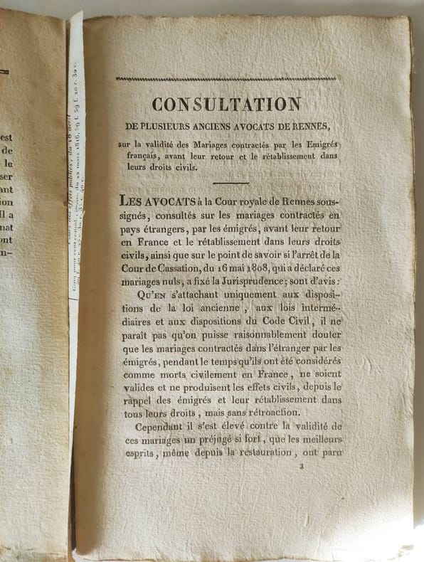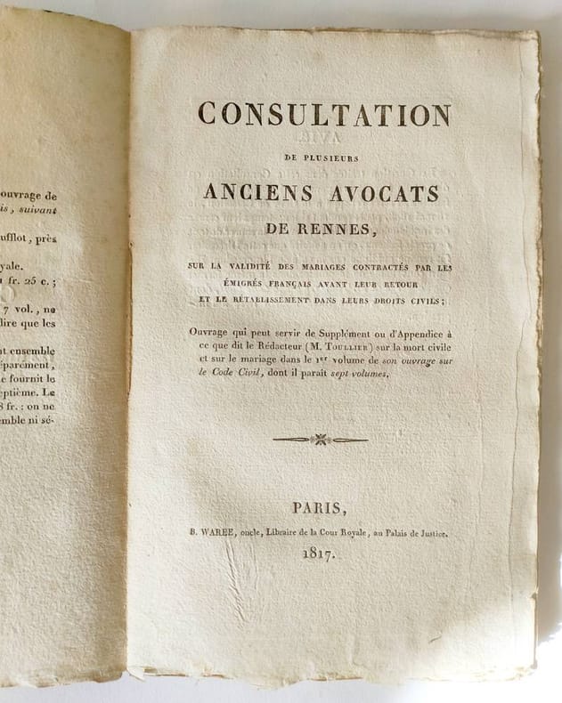 B. Waree, oncle, Libraire de la Cour Royale, au Palais de Justice "Paris, 1817, in-8 broché, couverture muette, 2ff.-58pp.-1f. De catalogue. ""La question traitée dans cette consultation est d'une telle importance pour un si grand nombre de familles, l'arrêt échappé de la Cour de Cassation, le 16 mai 1808, peut, pendant si longtemps leur causer des inquiétudes si cruelles, et devenir la source de tant de procès fâcheux, qu'on a désiré que cette discussion fût rendue publique par la voie de l'impression."" Extrait de l'Avis. Selon un arrêt de la Cour de cassation du 16 mai 1808, le mariage d'un émigré contracté à l'étranger était nul, sans effet, même après l'amnistie."
