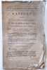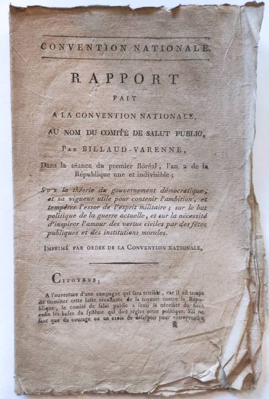 De L'Imprimerie Nationale "Paris, Sd (1794) in-8 en feuilles, 15pp. (le verso du dernier feuillet est blanc). Intervention dans laquelle Billaud-Varenne, proche des positions de Robespierre, s'oppose à la guerre de conquête. ""Et toi suffi, tremble, Albion ! L'heure de ta décadence n'est pas éloignée. Tu n'as eu jusqu'à ce jour que l'audace du crime : ta faiblesse est démontrée par la lâcheté de tes moyens."" Martin et Walter, catalogue de l'histoire de la Révolution Française 3390. Premier feuilli un peu jauni."
