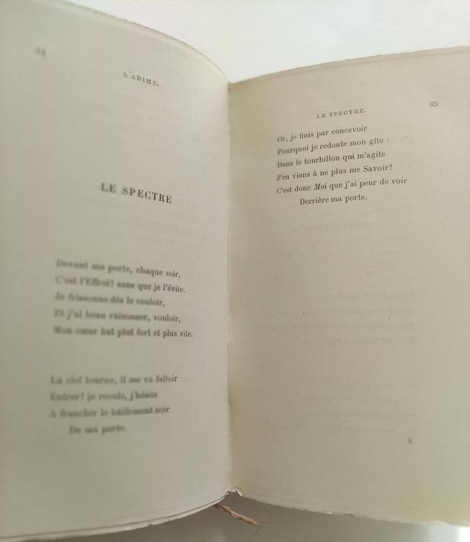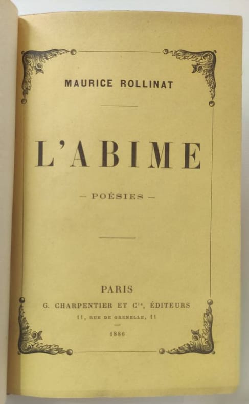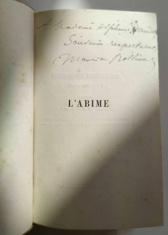 G. Charpentier, Editeur "Paris, 1886, in-12 bradel demi-percale grise, pièce de titre de cuir noir, date en queue, plats de couverture conservés. Reliure signée de Paul vié. 2ff.-292pp. Edition originale. Envoi autographe de l'auteur à Madame Alphonse Daudet. ""A madame Alphonse Daudet, Souvenir respectueux. Maurice Rollinat"". Rollinat était ami avec le couple Daudet et les visitait fréquemment lors de son séjour parisien. Des 1883, il dédiait Rondeau de printemps, l'un des poèmes des Névroses à Alphonse Daudet. Bel exemplaire en reliure de l'époque, au papier étonnamment de bel qualité pour cet éditeur."