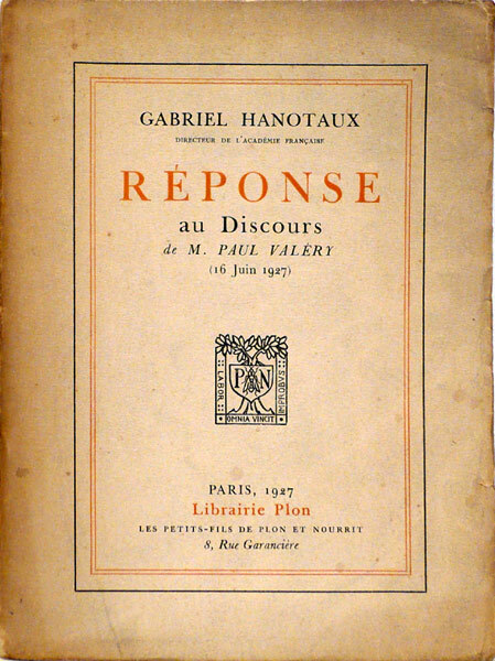 Librairie Plon 14,5 x 19,5 Paris Edition Originale 1927 Broché, 58 p. Edition originale. Réponse au discours prononcé le 16 juin 1927 par Paul Valéry lors de sa réception à l'Académie française. Exemplaire n°572/1150 sur Vélin pur fil des papeterues du Marais. Usures d'usage, rousseurs, mais bon exemplaire.(B66)