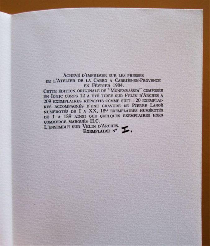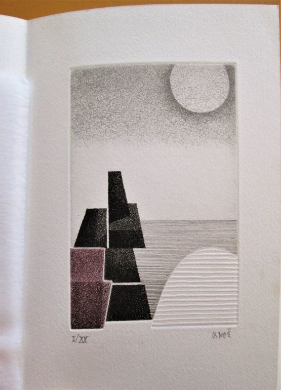 Cabriès-en-Provence, Lettres de Casse, 1984. In-8 broché (22,2 x 15 cm), couverture imprimée à rabats, non paginé.- EDITION ORIGINALE tirée à 189 exemplaires numérotés sur vélin d'Arches, celui-ci l'un des 20 exemplaires du tirage de tête, le n° I, accompagné d'une gravure de Pierre Lanoë. - 110g.- Très bel exemplaire.