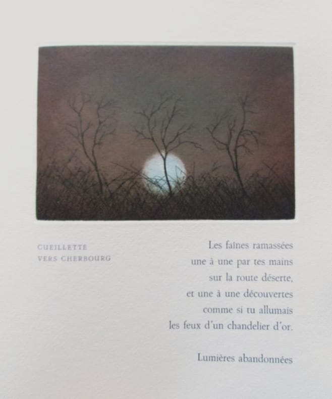 Paris, Les Bibliophiles de France et de Normandie, 1978. In-4 en feuilles (31 x 24,5 cm), couverture titrée, sous emboîtage éditeur, coffret cartonné recouvert d'une toile décorée en rouge et vert, pièce de titre sur le dos. Édition originale de 2 contes et des 25 poèmes, ornée de 11 gravures originales en couleurs et de 2 lettrines. Tirage à 175 exemplaires sur papier vélin de Rives, celui-ci le n° 84, signé par l'artiste. Très bel exemplaire, très frais, pour ce livre remarquablement illustré des aquatintes de Jean-Jacques-Joachim RIGAL