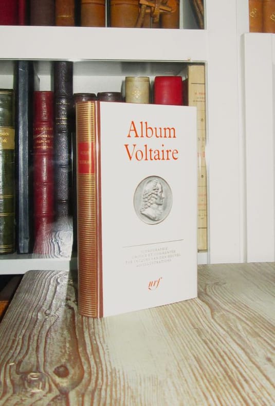 Coll. "Pléiade - Album" n° 22, Paris, éd. Gallimard, 8 mars 1983, EDITION ORIGINALE, in-12, pleine basane havane éd., jaquette ill. en noir et rhodoïd éd., emboîtage carton éd., 328 pp., ill. par 432 reproductions de documents anciens en noir, Toute la vie et l'œuvre de Voltaire dans cette prestigieuse collection. Bien complet de la jaquette, du rhodoïd et de son emboîtage carton éditeur. Jamais lu ! Très bon état