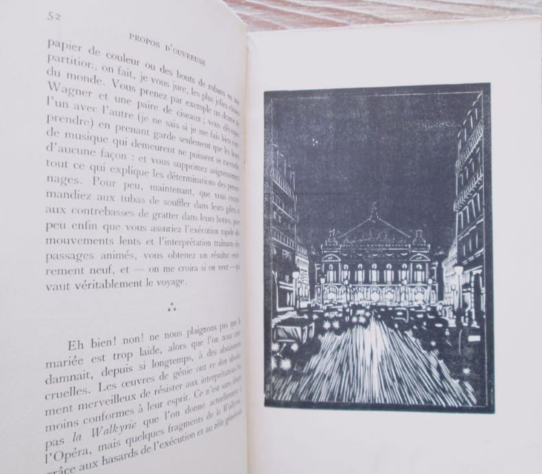 Edition originale. Texte de Henry Gauthier-Villars dit Willy. Portrait de l'auteuret des bois gravés et dessinés par Robert Barriot. Deux lettres-préfaces de Colette. Propos sur Gounod, Berlioz,Wagner, Saint - Saens, La réforme de la musique religieuse, Bayreuth, Wagner et Nietzsche ... Un des 800 exemplaires numérotés sur Vélin Alfa, celui-ci venant de la bibliothèque des usines Renault. Il est couvert d'un protège livre en papier titré au non du Cercle des usines Renault, 135 avenue Edouard-Vaillant, avec la consigne "Ayez soin de ce livre". Colé sur le contre-plat de la couverture , bel ex-libris portant le numéro de l'ouvrage et montrant le fameux char d'assault Renault FT écrasant des livres. Le premier feuillet blanc porte lui le tampon de l'Amicale du groupe Renault. > Etonnante provenance pour ce livre pas fréquent. Bon 0