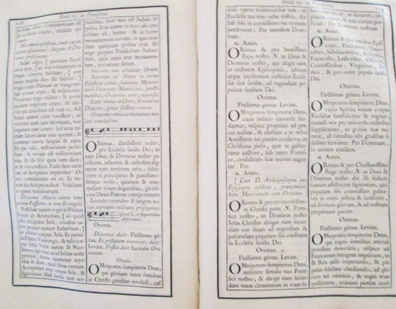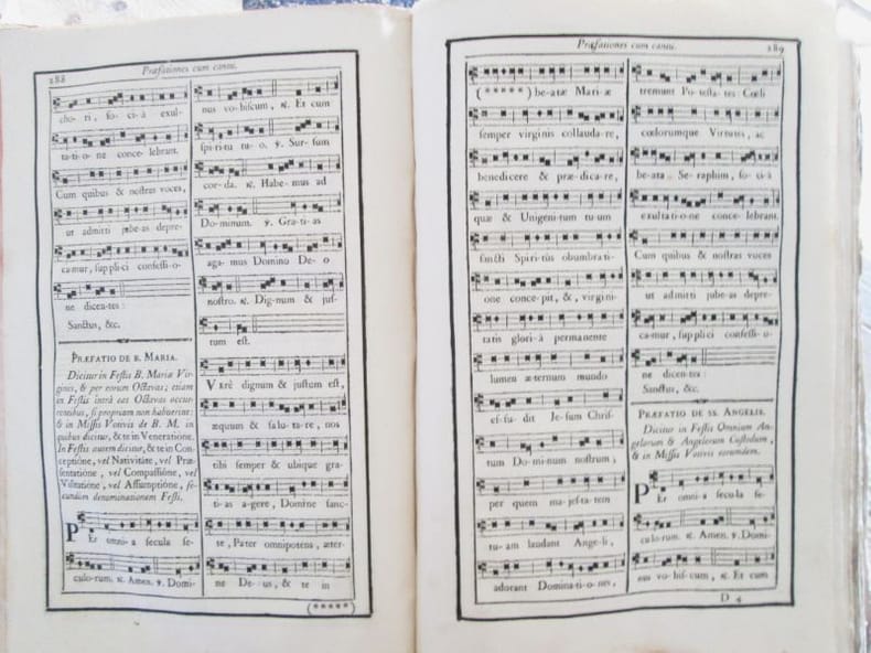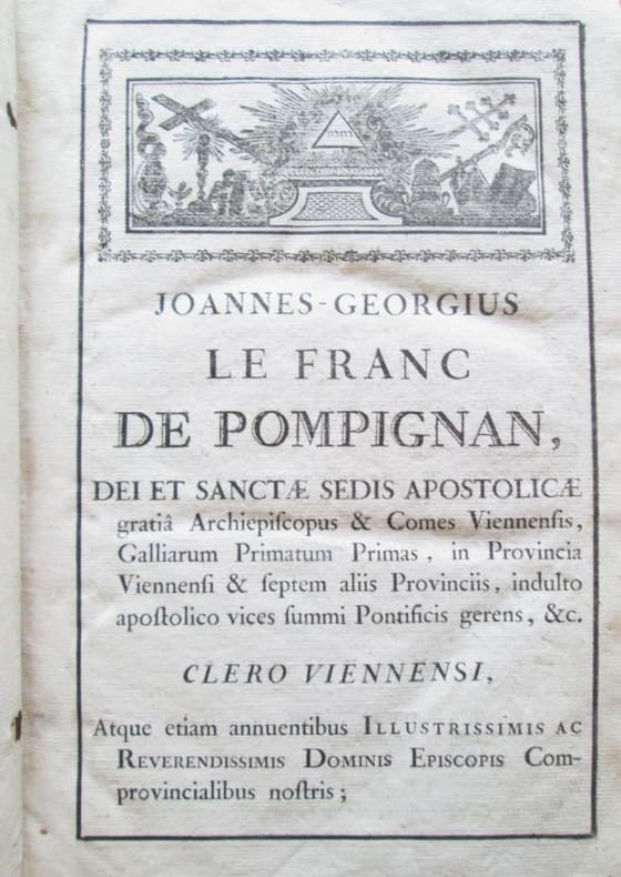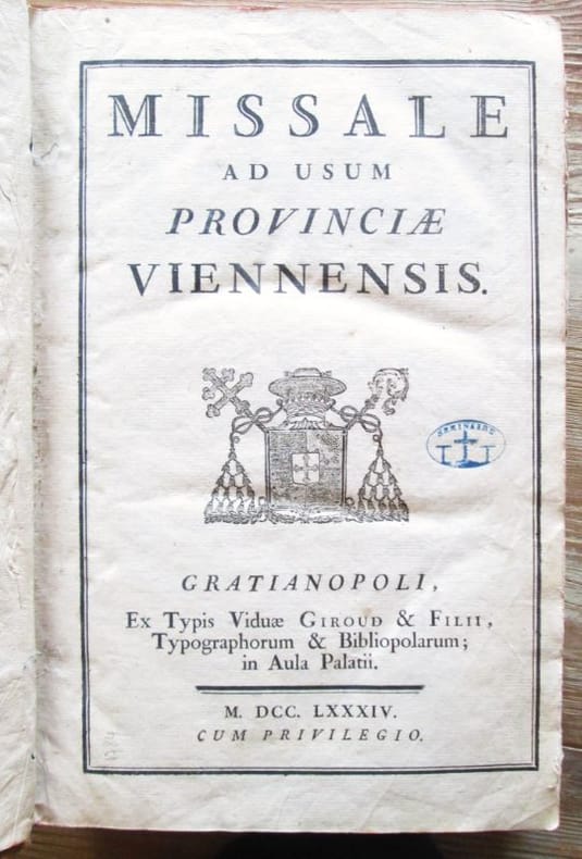 Gratianopoli : ex typis viduae Giroud et filii, 1784. Jean-Georges LE FRANC DE POMPIGNAN : MISSALE AD USUM PROVINCIAE VIENNENSIS.. In-folio relié plein veau d'époque (34 x 22 cm), dos à nerfs, 11 ff. non chiffrés (dont la table des fêtes mobiles et le calendrier), LX, 712, CLXXV p., plain-chant (Supplementum ad proprium sanctorum ajouté) CLXXV, cantiques notés, gravure hors texte montrant le Christ en croix par Audran. Coins, bords des plats et coiffes usés, frottements. cahiers au centre de l'ouvrage un peu décalés. Ce missel est orné de têtes de chapitre, lettrines, culs-de-lampe. Bon état général, malgré l'usure de la reliure, elles est solide.- Ce missel fut publié sous les auspices de son archevêque de Vienne Jean-Georges Le Franc de Pompignan (1715-1790)