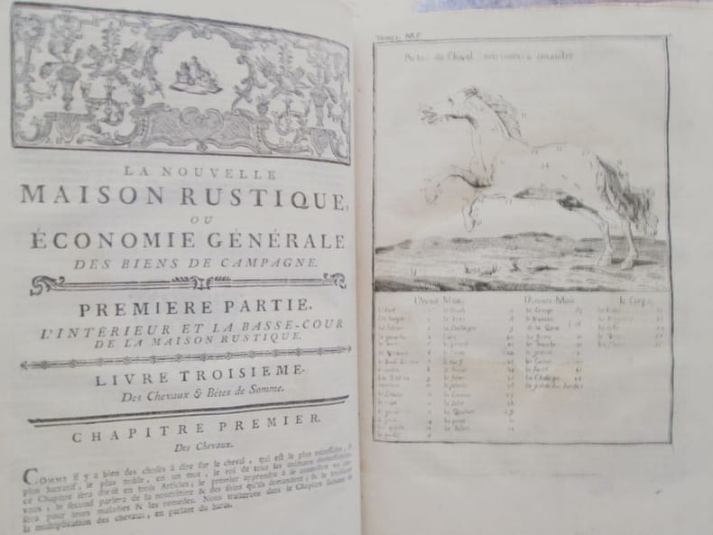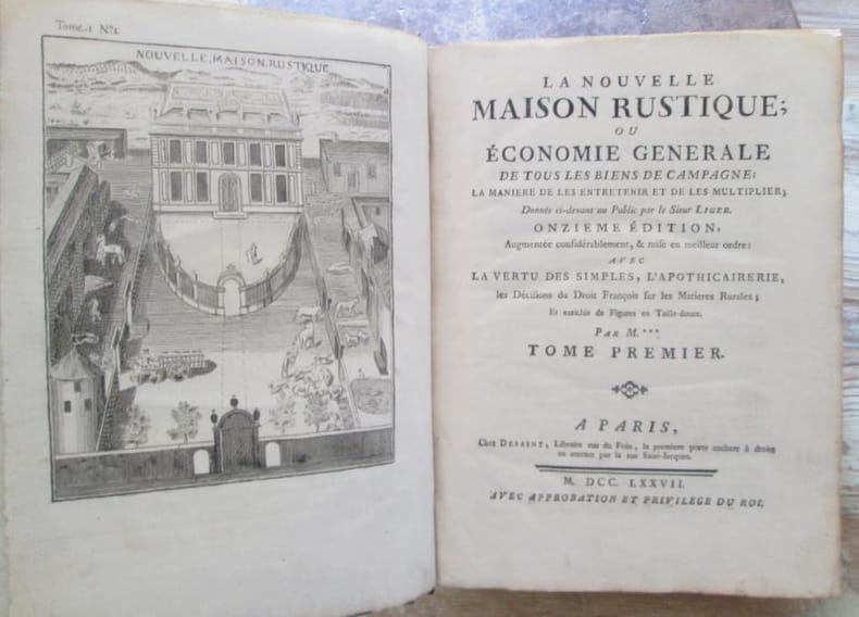 Un classique de l'économie rurale. “fondée sur l'expérience & les nouvelles découvertes, ... avec des observations critiques, neuves & intéressantes: L'acquisition d'une terre & biens de campagne, les bâtiments, les provisions & l'économie intérieure de la maison rustique. Vicaire, Bibliographie gastronomique 521; Oberlé 617/618; cf. Quérard V/304. Image disp.