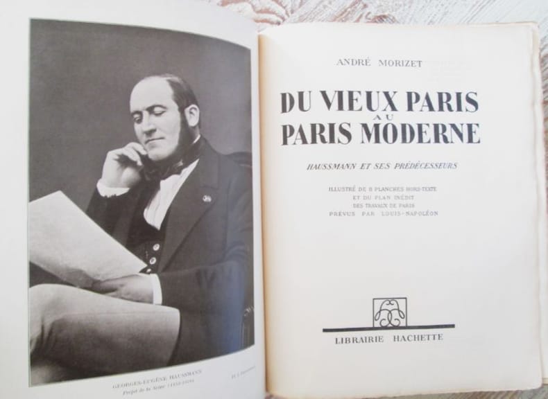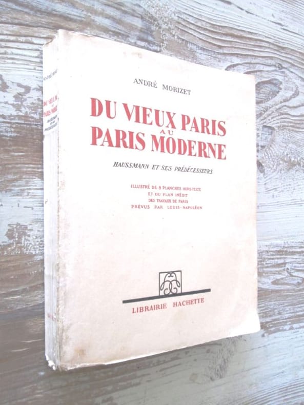 43. Du vieux Paris au Paris moderne, Haussmann et ses prédécesseurs. edition Hachette, Un volume grand in-8 (24 cm x 19 cm), 399 pp. Illustré de 8 planches hors texte et du plan inédit des travaux de Paris prévus par Louis-Napoléon. Broché. Complet du plan dépliant des travaux de Paris prévus par Louis-Napoléon. Bon etat photo possible