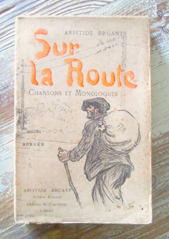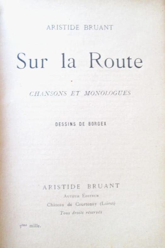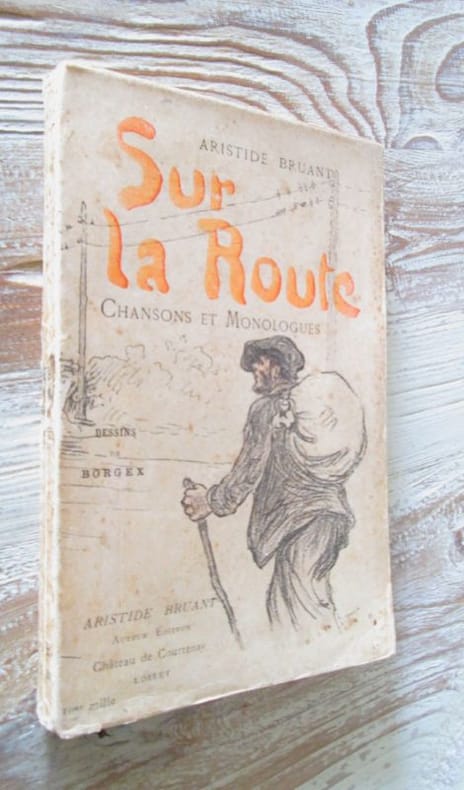 Château de Courtenay (Loiret) chez l'auteur 1897 1 vol. Relié in-12, demi-chagrin vert, dos à nerfs orné de caissons dorés, 206 pp., nombreux dessins par Borgex. Mention de deuxième mille. Il s'agit du troisième et dernier recueil de chansons réalistes d'Aristide Bruant qui firent sa fortune, délaissant les cloaques de Montmartre pour un coquet château dans le Gâtinais... Dos légèrement passé, mais exemplaire bien relié et complet de la belle couverture illustrée en couleurs par Borgex conservée d'un seul tenant au début du volume.