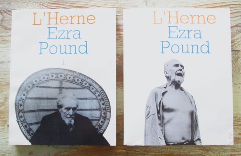 Paris : Editions de l'Herne, 1965 et 1966. 2 tomes in-4 brochés (27 x 21 cm), 730 pages, Cahier Ezra Pound - Dirigé par Dominique de Roux et Michel Beaujour., illustrés de nombreuses planches photographiques, bibliographie de 10 pages in-fine. Témoignages de T.S. Eliot, William Carlos Williams, Michel Butor, E. E. Cummings ou John Cowper Powys. Des poèmes, dont certains Cantos, traduits par Denis Roche et Pierre Alien, des lettres adressées à Louis Aragon et James Joyce, les Causeries de Pound à Radio Rome font de cet ensemble une stèle impressionnante et fondatrice. Textes de : Eva Hesse, John Cowper Powys, William Carlos Williams, Clark Emery, Piero Sanavio, A.M Leoni de Hornung, Stephen Nichols, Noel Stock, Georges Cattaui, Hugh Kenner, William Fleming, Forrest Read, Gianandrea Gavazzeni, John Espey, William Mc Naughton, Lawrence Chisolm, Jacques de Mougin, Lawrence Ferlinghetti, Marianne Moore, François Weyergans, Alain Bosquet, Allen Tate, W.K Rose, W. Moelwyn Merchant, David Horton, Dudley Kimball, Domenico di Paoli, Michael Weaver, Guy Davenport, Donald Gallup, Nelo Risi, Pierre Bernard, Claude Pelieu. Interviews, correspondances, , belle iconographie. Très bon état des deux volumes de ces Cahiers de l'Herne consacrés à Ezra Pound, en première édition.