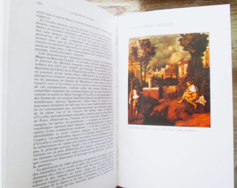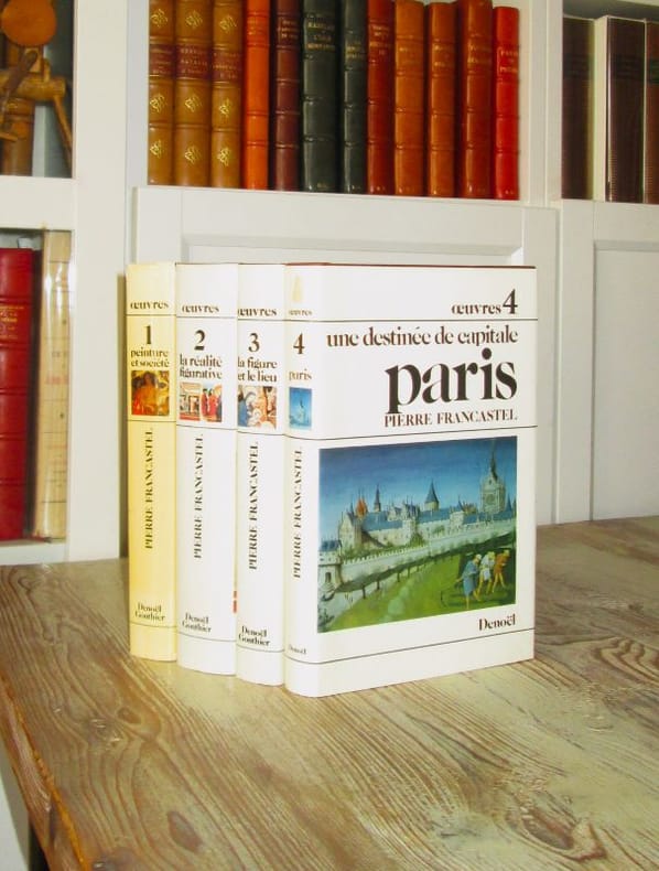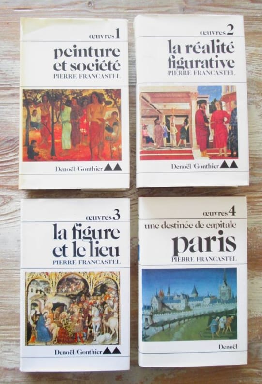 Denoël/Gonhier, 1977-1984 4 volumes in-8 reliés sous jaquette illustrée (22 x 14 cm), 360-441-285 et 174 pages, nombreuses illustrations. Tome 1 : Peinture et Société. Naissance et Destruction d'un Espace Plastique. De la Renaissance au Cubisme. Tome 2 : La réalité figurative; Eléments structurels de sociologie de l'Art. Tome 3 : La figure et le lieu. L'ordre visuel du Quattrocento. Tome 4 : Une destinée de capitale. Paris. Illustration réunie et présentée par Galienne Francastel et Jacques Barbe. Très bon état.