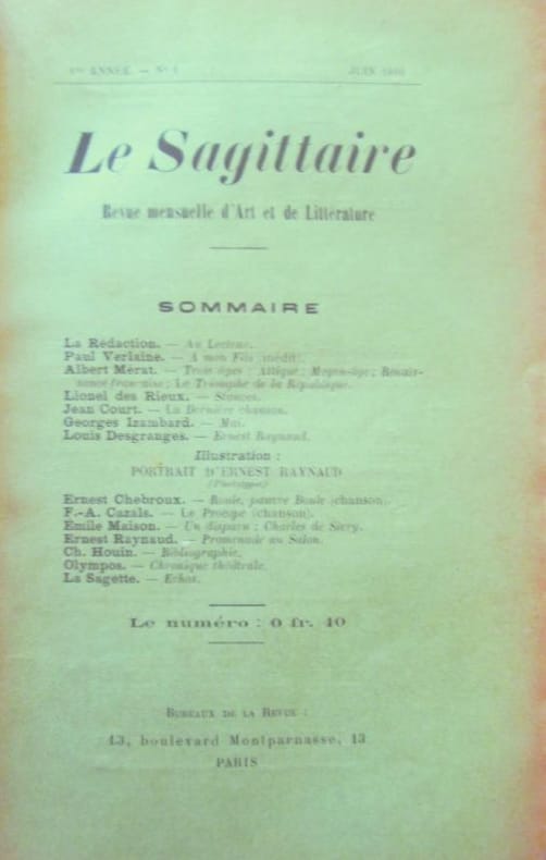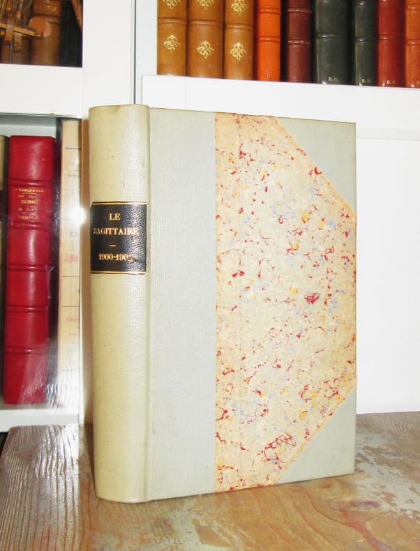 Collection complète. 16 numéros en 16 livraisons en 1 vol in-8 relié (23 x 14,5 cm), demi-reliure à coins, couvertures conservées. N° 1, juin 1900-n° 16, octobre-novembre 1901. Paris, Directeur : Ernest Raynaud, Administrateur : Charles Houin, Gérant : F.-A. Cazals. Textes de Henri Beauclair, F.-A. Cazals, Léon Cazes, Charles Cros (Vers inédits), Ernest Delahaye, Achille Delaroche, Jules Depaquit, Léon Frapié, Ernest dHervilly, Charles Houin, Georges Izambard, Edmond Jacques, Francis Jammes, Gustave Kahn, Léon Maillard, Albert Mérat, Jean Moréas, Charles Morice, Rachilde, Ernest Raynaud, Lionel des Rieux, Léon Riotor, Pierre de Saint-Jean, Charles Saunier, Paul Verlaine (Inédit), etc. Portraits h.-t. de : F.-A. Cazals, Eugène Ledrain, Albert Mérat, Ernest Raynaud, Léon Riotor, James Vibert, Gabriel Vicaire. Le n° 14 (août 1901) est consacré à Arthur Rimbaud. ON JOINT : : Une lettre autographe signée dErnest Raynaud (s.d.) adressée à Léon Maillard (compte absolument sur son article pour le n° du Sagittaire en préparation) ; 1 L.A.S. de F.-A. Cazals (15/10/1914) adressée à Léon Maillard (provisoirement suspendu, privé de traitement, a besoin daide pour éviter une peine disciplinaire) ; Le n° 4/5 (février-mars 1906) de la Revue dArdennes & dArgonne contenant larticle de Ernest Delahaye : « Le Séjour de Paul Verlaine dans les Ardennes (1877-1883) », qui fait suite et fin aux articles publiés dans Le Sagittaire sous le titre « Pauvre Lélian » ; Portrait original à la plume de Léon Maillard par Ernest La Jeunesse avec dédicace ; Portrait de Jean Moréas (reproduction du portrait publié dans Les Têtes de pipe) ; Portraits de Cazals par H.-G. Ibels, Ernest La Jeunesse, Jean Moréas, Rachilde. Très bel exemplaire.