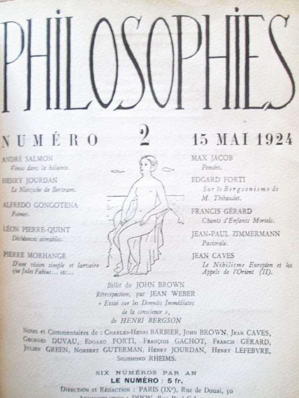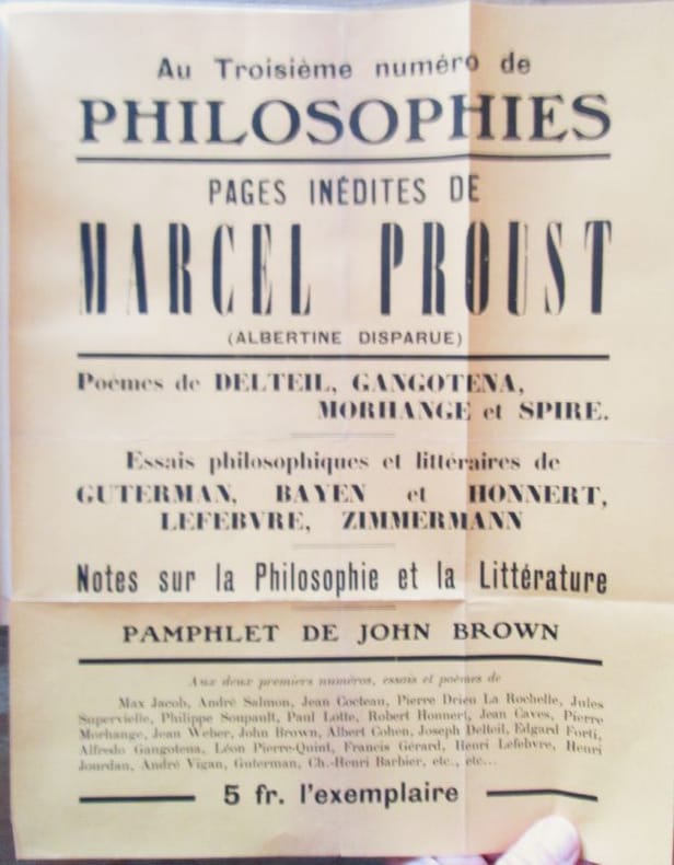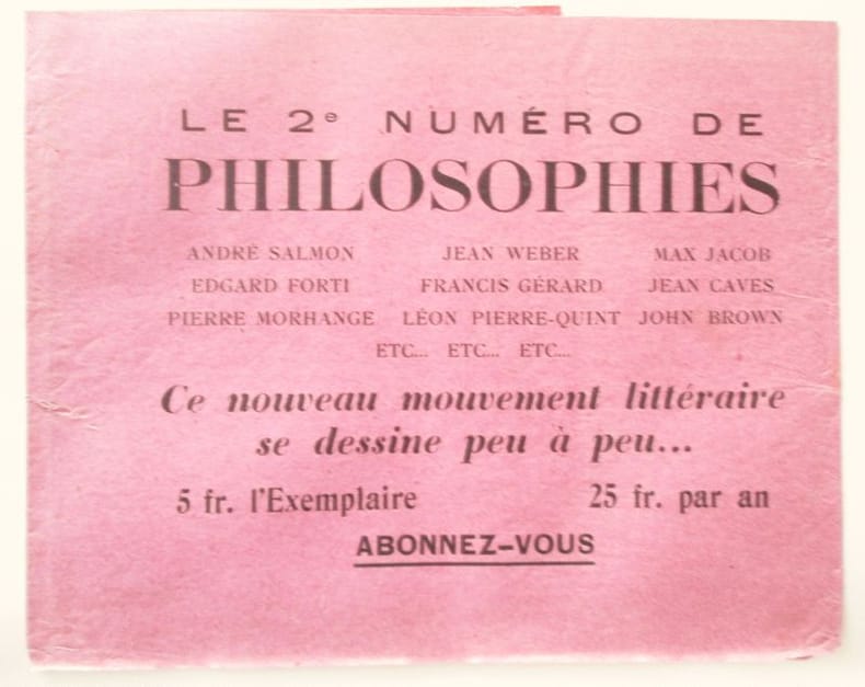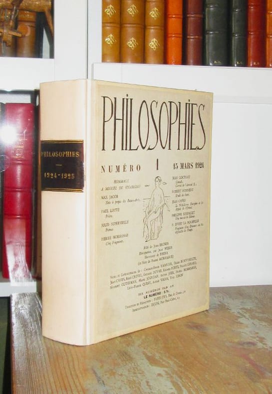 Paris / Dijon, Directeur : Pierre Morhange, Comité : Norbert Guterman, Henri Lefebvre. Collection complète du n° 1, 15 mars 1924 au n° 5/6, mars 1925. 1 vol. in-4 relié (24 x 19 cm) demi-parcaline ivoire, titre doré sur pièce d e asane rouge, couvertures conservées. Textes de John Brown, Jean Cocteau, René Crevel, Joseph Delteil, Pierre Drieu La Rochelle, Alfredo Gangotena, Francis Gérard, Norbert Guterman, Max Jacob, Marcel Jouhandeau, Henri Lefebvre, Pierre Morhange, Léon Pierre-Quint, Georges Politzer, Marcel Proust, André Salmon, Philippe Soupault, André Spire, Jules Supervielle, Jean-Paul Zimmermann, etc. ON JOINT : La circulaire datée du 14 mars 1924 annonçant la parution de la revue Philosophies à dater du 15 mars 1924 ; 1 article signé G. Michael sur le n° 5/6 de Philosophies, publié dans Clarté, n° 74 (mai 1925) ; Portraits de Marcel Jouhandeau, Julien Green, Paul Éluard, Jean Cocteau ; 1 photo originale inédite de Max Jacob ; 1 prospectus annonçant au 3e numéro des pages inédites de Marcel Proust ; La bande annonce du n° 2. Très bel état.