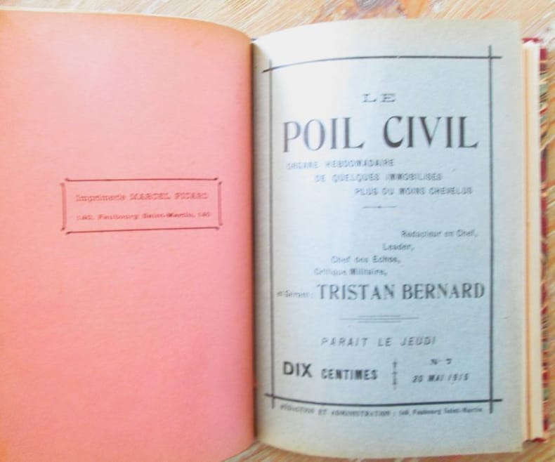LE POIL CIVIL Organe, en principe, hebdomadaire des réserves de larmée inactive, puis Organe hebdomadaire de quelques immobilisés plus ou moins chevelus. Du n°1, 2 avril 1915 au n° 15, 15 juillet 1915. Collection complète. 15 numéros en 15 livraisons en 1 vol in-12 relié demi-percaline bleu marine, titre doré sur le dos (couvertures conservées). Envoi autographe de Tristan Bernard sur la couv. du n°1. Très bel exemplaire.