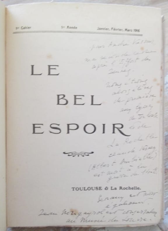 Toulouse et La Rochelle. Du n° 1, anvier-février-mars 191 au n° 3, juillet-août-septembre 1916. Collection complète. 3 numéros en 3 livraisons en 1 vol. in-12 relié pleine toile écrue, titre au dos, couvertures conservées. Textes de Pierre Camo, Francis Carco, Philippe Chabaneix, Tristan Derème, André Derzac, Paul Fort, Maurice Magre, Jacques Nervat, Jean Nougayrol, Pierre Senaux, Henry Sirben, Hector Talvart, Hélène Vacaresco, Claude Verney, etc. ON JOINT : Une photo originale de Philippe Chabaneix avec bel envoi autographe signé à André Vasseur ; Une lettre autographe signée de Tristan Derème (septembre 1923) à [Jacques Boulenger], avec son portrait ; Un portrait de Francis Carco. En bel état, rare.