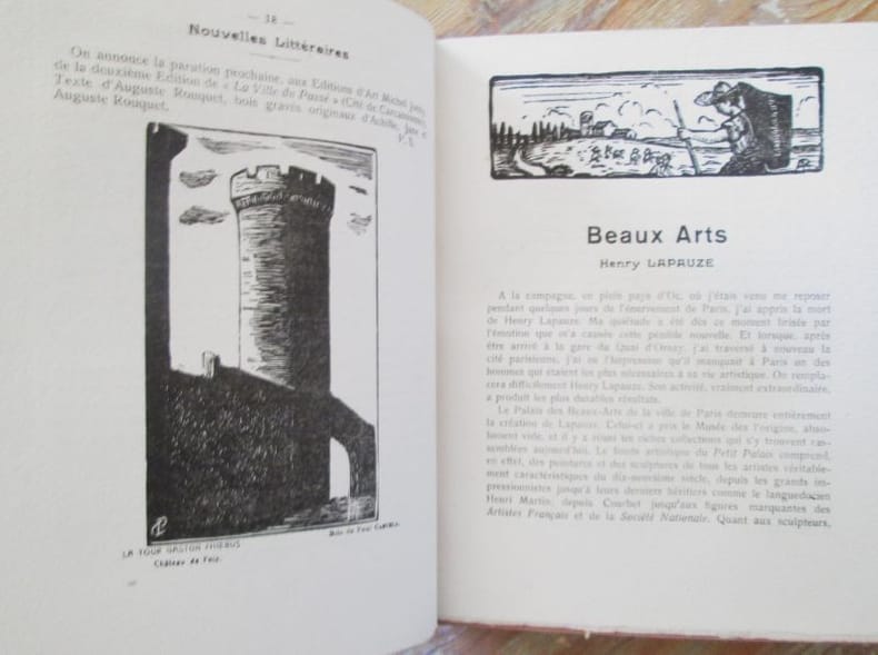 Paris, Secrétaire : Auguste Rouquet, 1925-1926. Première série (qui a été suivie d'une autre, en 1927). 1ère série : Du n° 1, août 1925 au n° 16/17, novembre-décembre 1926. 17 numéros en 8 livraisons en 1 vol. in-8 relié (21 x 17 cm) demi-maroquin vert clair, couvertures originales conservées. Textes de Paul Albarel, Achille Astre, Léon Auriol, Charles-Brun, Fernand Crémieux, Jo Ginestou, Jean Lebrau, Frédéric Saisset, Paul Sentenac, Touny-Lerys, etc. Magnifiques bois gravés de Gaspard Maillol, Paul Castela, Auguste Chabaud, Louis Claudel, Achille Rouquet, Max Théron, Henry Noell, Frédéic Saisset, A. Bausil; Jean Camp. Portraits de Paul Valéry, Joseph Delteil, Jean lebrau, Charles-brun...etc. Exemplaire sur grand papier : un des 35 sur papier de Montval. Fort rare, très bon état.