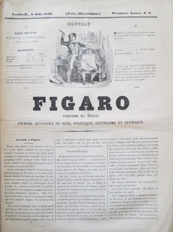 Paris, 1848. Du n°1, jeudi 8 juin 1848 au n° 6, jeudi 15 juin 1848. 6 livraisons de 4 pages chacune, au format in-4 sous étui et emboîtage très soignés, vignette illustrée et titre au premier plat. .Gérant : Thiery. Les articles ne sont pas signés. Dans chaque numéro un dessin pleine page de Quillenbois (dit Charles Marie de Sarcus). Rare, très bon état.