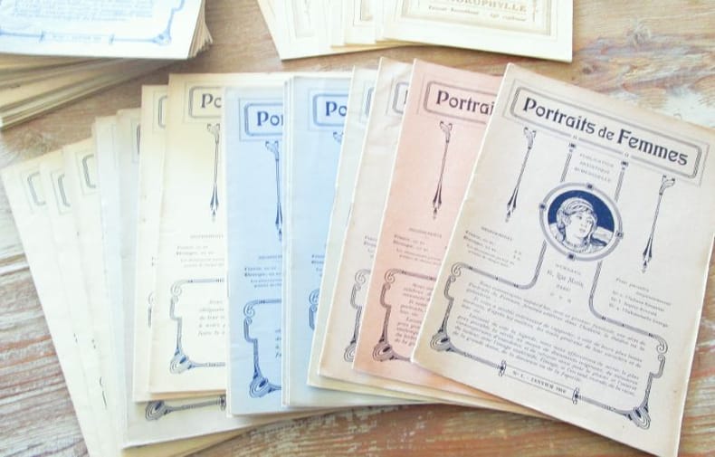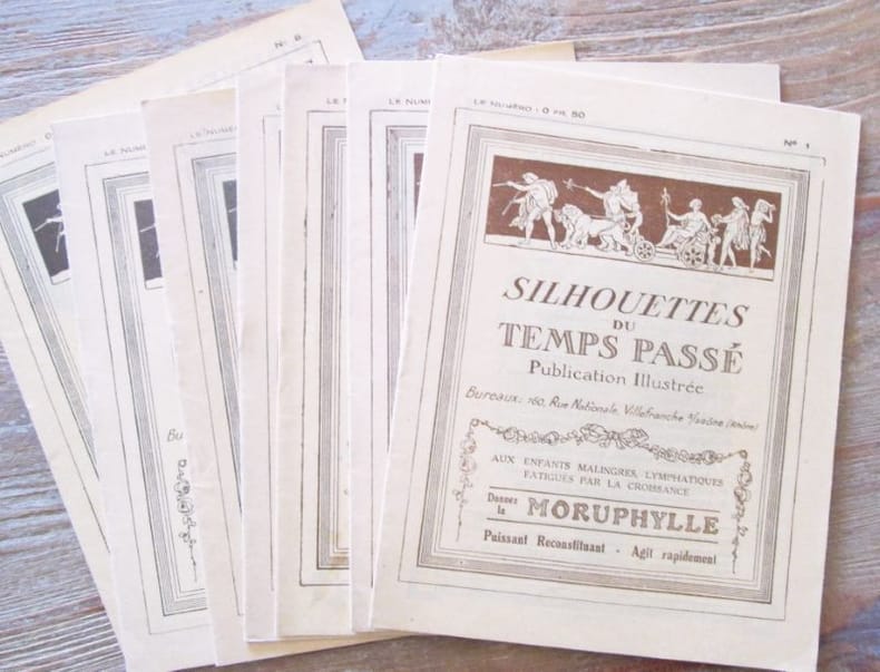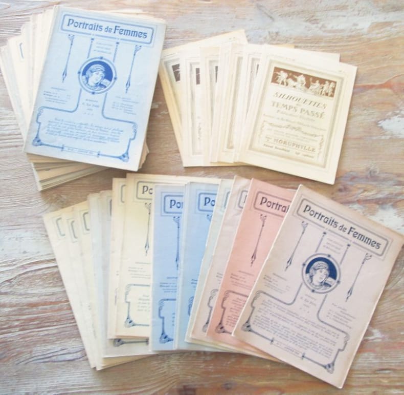 Paris, 1910-1913. Du n°1, janvier 1910 au n° 52, février 1913. Gérant : M. Desbois (Publication de relations publiques dun laboratoire pharmaceutique). Tous les textes sont de Émile Henriot. Portraits de Diane de Poitiers, Madame Récamier, Sophie Arnould, Ninon de Lenclos, Madame de Sévigné, Marie Stuart, Madame Favart, Charlotte Corday, Lucile Desmoulins, George Sand, Marie Antoinette, Catherine de Médicis, Jeanne dArc, Louise Colet, etc., 52 numéros en 52 livraisons in-12 agrafées, sous emboîtage, avec SILHOUETTES DU TEMPS PASSÉ : Publication illustrée, Villefranche-sur-Saône, n°1 à 8, s.d. [1925]. Gérant : Ch. Salmon (Publication de relations publiques dun laboratoire pharmaceutique). Textes, non signés, sur La Duchesse du Maine, Mme de La Fayette, Mlle de Lespinasse, Marie Mancini, La Clairon, Cléopâtre, La Duchesse dAbrantès, Madame de Custine. 8 numéros en 8 livraisons in-16 agrafées. L'ensembles de fascicules sont sous un double emboîtage cartonné au format 20,5 x 15 cm. Très bon état.