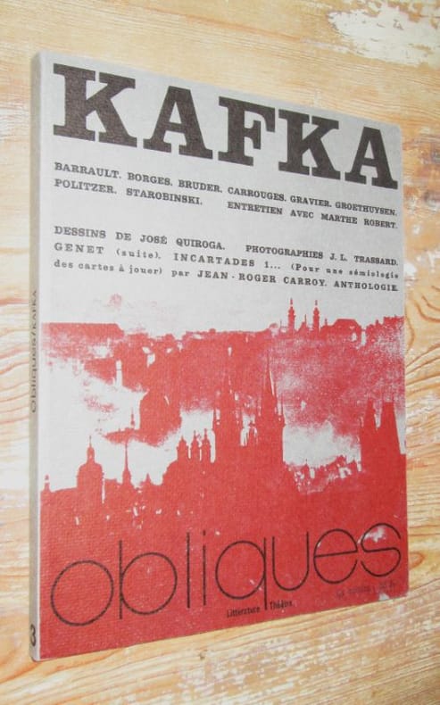 Obliques, 1973, numéro 3. In-4 broché (27,5 x 21 cm), couverture illustrée, 160 p., abondante iconographie : Dessins de José Quiroga. Textes de Barrault, Borges, Bruder, Carrouges, Gravier, Groethuysen, Politzer, Starobinsky. Entretien avec Marthe Robert. Très bon état.