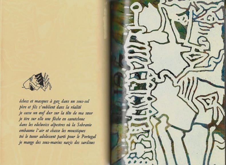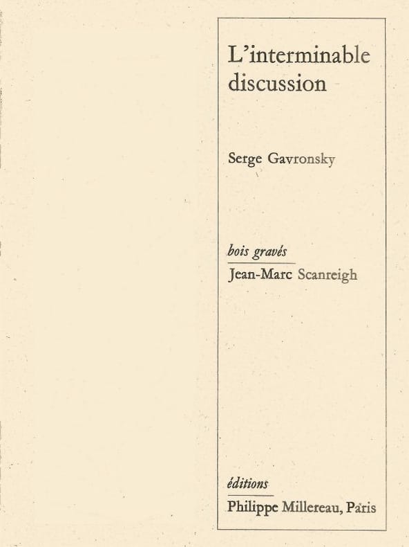 Paris, éditions Philippe Millereau, 1996. In-8 broché (22 x 16 cm), couverture reliée à la chinoise, n. p.[32] p. Seize poèmes biographiques de Serge Gavronsky, accompagnés de 16 vignettes au trait et de 3 bois gravés par imprimés sur feuilles pliées à la chinoises, et 6 bois gravés en blanc sur les plats et rabats de la couv.Tirage à 60 exemplaires imprimés par Pierre Voisin. Ex. dartiste numéroté e. A., signé par lauteur et lartiste. Très bel exemplaire.