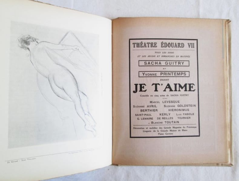 Paris, Directeur : Sacha Guitry, Gérant : Jean Vollerin. Du N° 1, 5 mai 1920 au n° 9, 5 janvier 1921. Collection complète. 9 numéros en 9 livraisons en 1 vol. in-4 relié de pleine toile, plats avec titres et illustrations. Textes de Maurice Barrès, Henry Bataille, René Benjamin, Tristan Bernard, Georges Courteline, Henri Duvernois, Claude Farrère, Robert de Flers, Lucien Guitry, Sacha Guitry, Robert de Montesquiou, Fernand Vandérem. Notes manuscrites de Vasseur (2 ff.). Joint : 1 billet autographe signé Sacha Guitry, non daté, sur un papier à en-tête : Cap Martin Hôtel près Menton (adressé à sonpère ?) : cest un projet bilan pour Le Courrier de Monsieur Pic ; Des extraits de journaux publiés à la mort de Sacha Guitry ; 1 portrait de Sacha Guitry, bois original et inédit de René Bertrand, extrait de la revue Luvre, n° 5, mai 1912. Rare. Intérieur très frais, bon état.