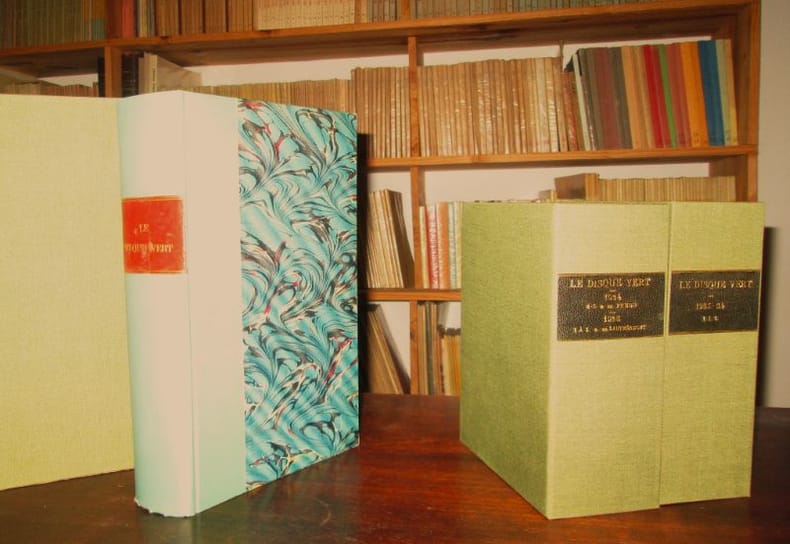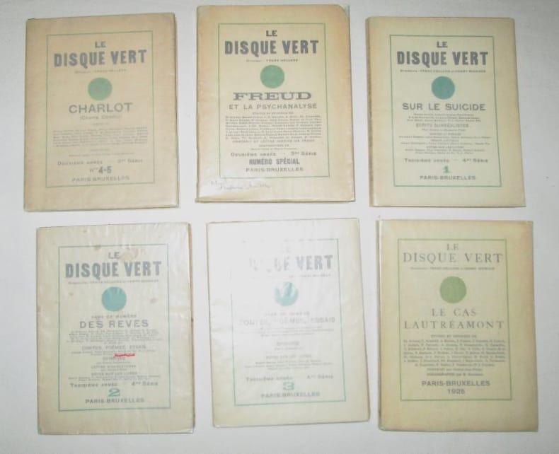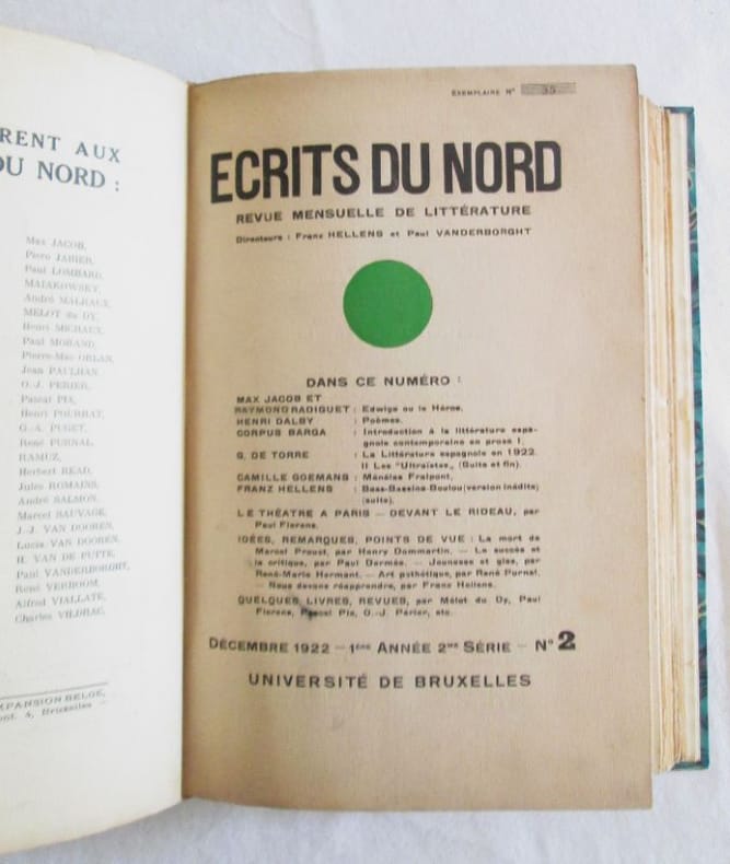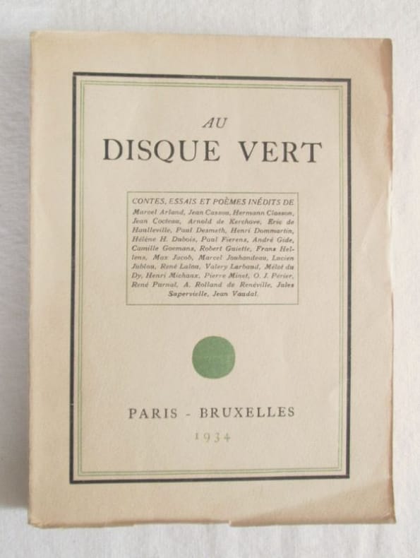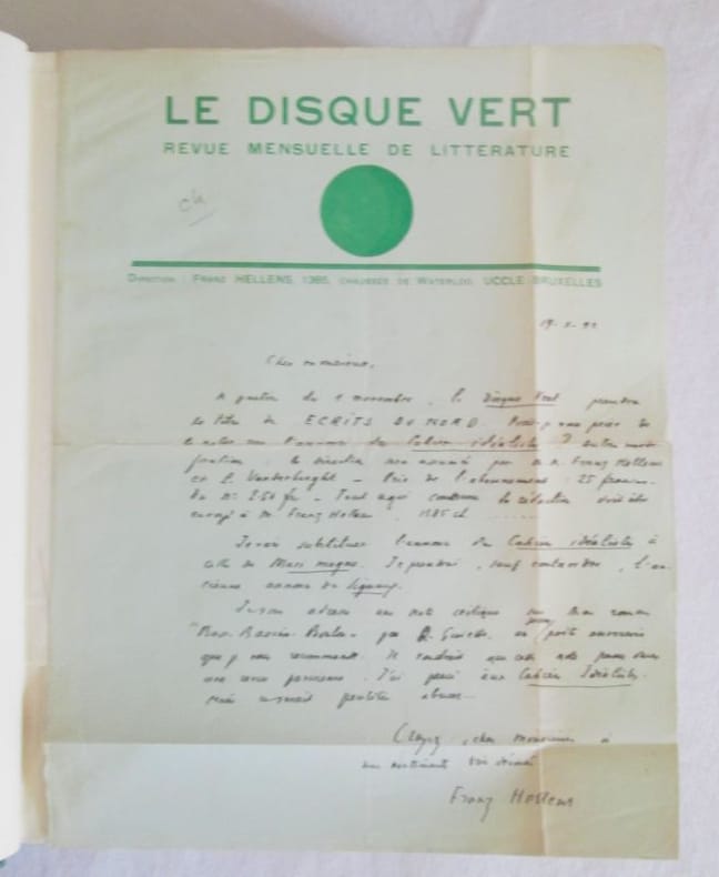 Paris-Bruxelles, Directeur : Franz Hellens, Comité de rédaction : En France : André Salmon, Jean Paulhan, En Belgique : Franz Hellens, Max Jacob, Mélot du Dy, Odilon-Jean Périer, Paul Fierens, Robert Goffin.- 1ère année, 1ère série : n° 1, mai 1922-n° 6, octobre 1922 ; 1ère année, 2e série, sous le titre Écrits du Nord : n° 1, novembre 1922-n° 3, janvier 1923 ; à nouveau sous le titre Le Disque Vert : n° 4 / 5 / 6, février-mars-avril 1923 ; 2e année : n° 1, octobre 1923-n° 3, décembre 1923 ; 2e année, 3e série : n° 4-5, 1924 (consacré à Charlot) + n° spécial « Freud et la psychanalyse », juin 1924 ; 3e année, 4e série : n° 1, 1925-n° 3, 1925 + n° spécial « Le cas Lautréamont », 1925 ; Nouvelle série : 1ère année : n° 1, avril 1953-n° 4, novembre / décembre 1953 ; Nouvelle série : 2e année : n° 5 janvier / février 1954-n° 6, mars / avril 1954 + « Hommage à Marcel Proust », Hors-série, décembre 1952 + « C.G. Jung », 1955 13 livraisons en 1 vol. in-4 relié sous emboîtage + 12 livraisons in-12 brochées sous 2 emboîtages et 4 vol. in-8 brochés. De mai 1922 à décembre 1923, la collection est sur papier de luxe (13 livraisons, n° 35, ex. de James Ensor, 3 fascicules portant sa signature au second plat de couverture). On joint au vol. relié : 1 Lettre autographe signée de Franz Hellens à [Édouard Dujardin] sur papier à en-tête du Disque Vert (19 octobre 1922) dans laquelle il est dit : « À partir du 1er novembre Le Disque Vert prendra le titre des Écrits du Nord » ; 1 Lettre autographe signée du libraire Paul van der Perre à André Vasseur (20 avril 1962) dans laquelle il est question du présent exemplaire. Ouvrages joints : Au Disque Vert,(Paris-Bruxelles, 1934) ; Le Dernier Disque Vert, Hommage à Franz Hellens (Paris, Éditions Albin Michel, 1957). Textes de René Alleau, Marcel Arland, Antonin Artaud, Gabriel Audisio, Corpus Barga, Samuel Beckett, Maurice Blanchard, André Breton, Claude Cahun, Jean Cassou, Blaise Cendrars, Charlie Chaplin, Jean Cocteau, Benjamin Crémieux, René Crevel, René Daumal, Joseph Delteil, Paul Dermée, Robert Desnos, Fernand Divoire, Édouard Dujardin, Paul Éluard, Serge Essenine, Étiemble, Florent Fels, Paul Fierens, André Gide, Camille Goemans, Robert Goffin, Ramón Gómez de la Serna, Robert Guiette, Éric de Haulleville, Franz Hellens, Henri Hertz, Marcel Jouhandeau, Léon Kochnitzky, Georges Lambrichs, Valery Larbaud, Marcel Lecomte, Michel Leiris, André Lhote, Pierre Mac Orlan, André Malraux, Mélot du Dy, René Micha, Henry Michaux, Jean Paulhan, Benjamin Péret, Odilon-Jean Périer, Pascal Pia, Léon Pierre-Quint, André Pieyre de Mandiargues, Georges Pillement, Francis Ponge, Henri Pourrat, René Purnal, Raymond Radiguet, C.-F. Ramuz, Pierre Reverdy, Georges Ribemont-Dessaignes, Jules Romains, André Salmon, Marcel Sauvage, Pierre Sichel, René de Solier, Philippe Soupault, Jules Supervielle, Henri Thomas, Paul Valéry, Henri Vandeputte, Alexandre VialatteEnsemble tout à fait remarquable, en bon état général.
