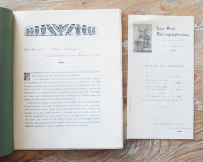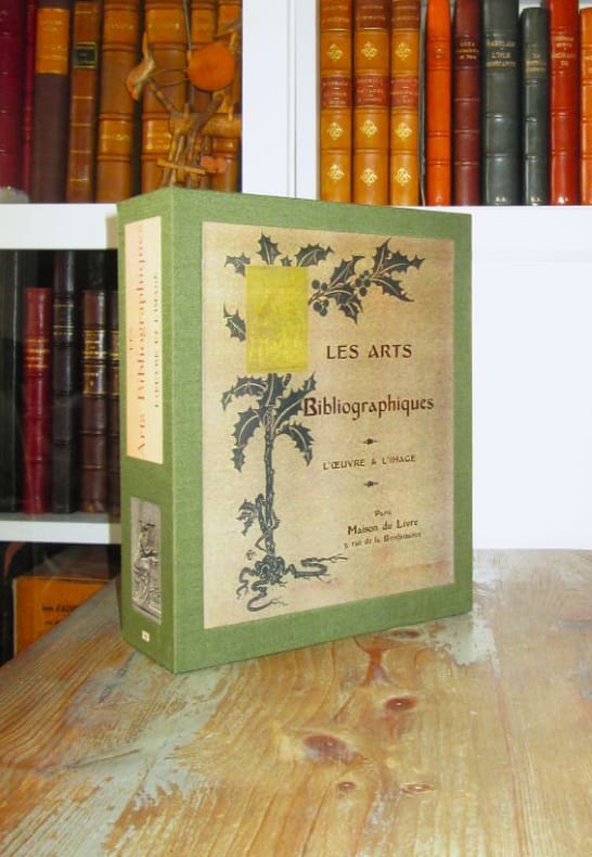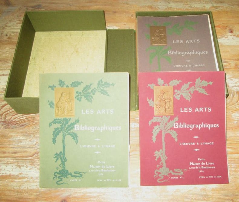 Paris (3 rue de la Bienfaisance) : Maison du livre, 1904-1907. Directeur Charles Meunier. 16 numéros de la revue, sous emboiîtage de pleine toile verte, illustré au premier plat et titré sur le dos. 1re année, Du n° 1 (janvier/mars 1904)-4e année, au n° 4 (octobre/décembre 1907). Cette revue prend la suite de "L'oeuvre et l'image, revue mensuelle". Comité de rédaction : Léon Thévenin, Albert Legrand, Georges Lemierre. Textes de Marcel Archinard, Claudio Antella, L. de Beaumont, Henri Blandin, Raymond Bouyer, Maurice Cabs, André Corthis, Jérôme Doucet, Franz Eitel, G. Élie-Berthet, André Foulon de Vaulx, Maurice Guillemot, G. Jean-Aubry, Gustave Kahn, Jeanne Landre, Albert Legrand, Georges Lemierre, Jules de Marthold, Camille Mauclair, Charles Meunier, Louis Morin, Anne Osmont, Eugène Rodrigues, Séverine, Franz Stoffel, Léon Thévenin, Édouard Trogan, Paul Vallorbe, Paul Vibert, etc. Paul Vallorbe etc.- Illustrations de Louis Hurez, Léon Marotte, L. Morin, Ch. Meunier etc. On joint : Tables des sommaires des années 1904-1905 et 1906-1907. Excellent état, imprimé sur beau papier, présentation soignée avec des frises gravées en tête de chapitre, lettrines, culs-de-lampe, illustrations photographiques hors-texte. très bel état, rare.