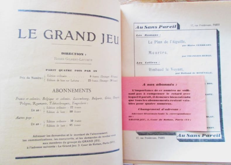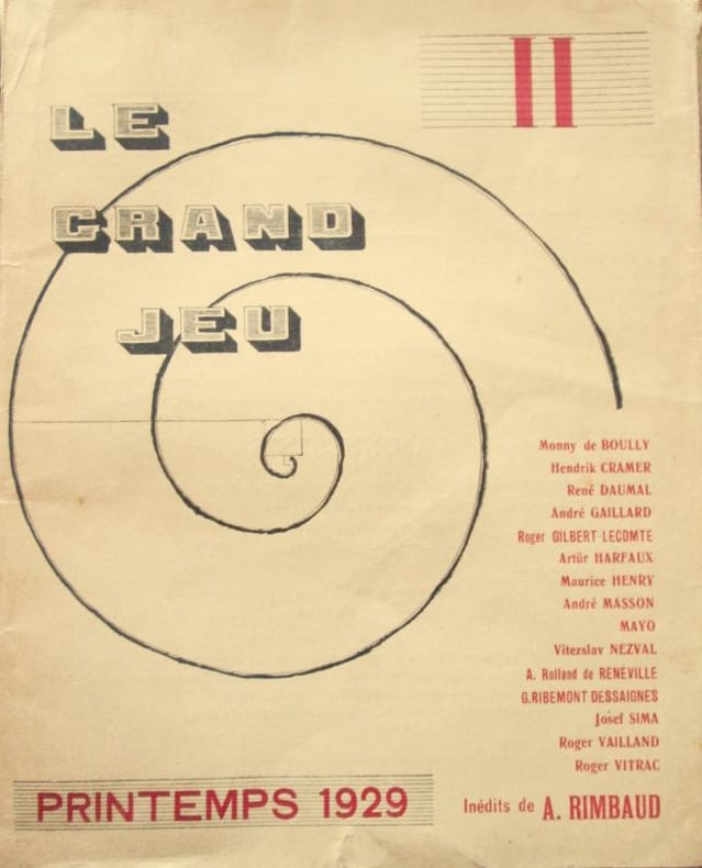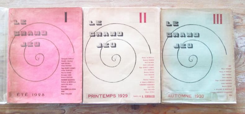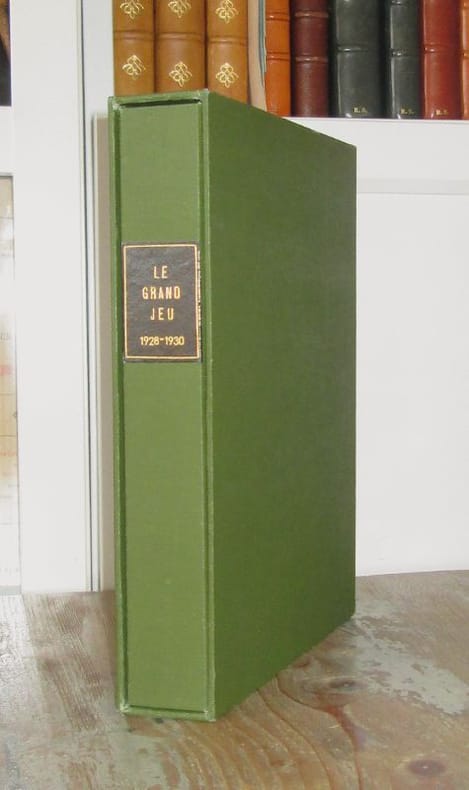Paris, du n° 1 (été 1928) au n° 3 (automne 1930). Direction : Roger Gilbert-Lecomte, René Daumal, Josef Sima, Roger Vaillant. Collection complète des 3 numéros en 3 livraisons in-8 brochés, sous chemise et étui de percaline verte, titre doré sur pièce de vasane rouge. Bien complet du papillon rose dans le tome II. Textes de Monny de Boully, Georgette Camille, Hendrik Cramer, René Daumal, André Delons, Robert Desnos, R. Gilbert-Lecomte, Maurice Henry, Pierre Minet, Georges Ribemont-Dessaignes, A. Rolland de Renéville, Roger Vailland, Roger Vitrac, André Masson, etc. Les exemplaires sont sans manques et sans rousseurs, ils ont été restaurés selon les règles officielles des bibliothèques et de la Conservation du Patrimoine (désacidifiés puis traités à la tylose). Très bel état. RARE.