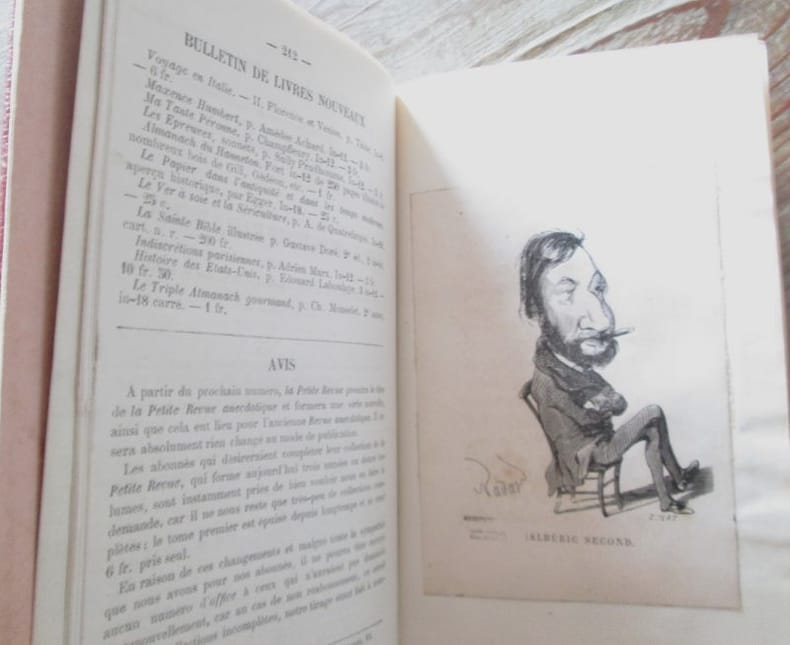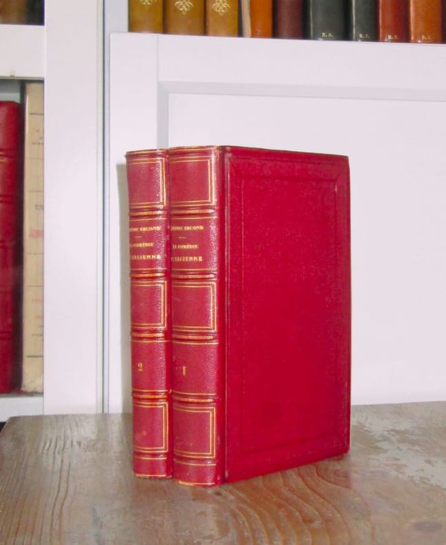 Paris : aux bureaux de l'Artiste : Gustave Havard, 1856-1857. N° 1, 7 décembre 1856-n° 24, 17 mai 1857. Paris, Directeur : Albéric Second. Collection complète. 24 numéros en 2 vol. in-12 reliés demi-chagrin rouge, titre doré sur le dos. La Comédie parisienne, entièrement rédigée par Albéric Second, fourmille danecdotes, de révélations mondaines et artistiques, de petits commérages sur le public féminin, elle fait revivre le monde des Lettres, des Arts, du Théâtre, des Concerts, en révélant bien des faits qui seraient restés ignorés. On Joint : Au Tome I : Le numéro du 10 novembre 1866 de la Petite revue pour un article sur Albéric Second ; 1 portrait charge de Albéric Second par Nadar ; Au Tome II : 1 coupure de LArtiste du 1er septembre 1867 pour une notice sur A. Second ; 1 portrait charge de Albéric Second ; Histoire Anecdotique et critique des 159 journaux parus en lan de grâce 1856 par Firmin Maillard (rare). Notes manuscrites de Vasseur, en un petit livret à part. Très bon état.