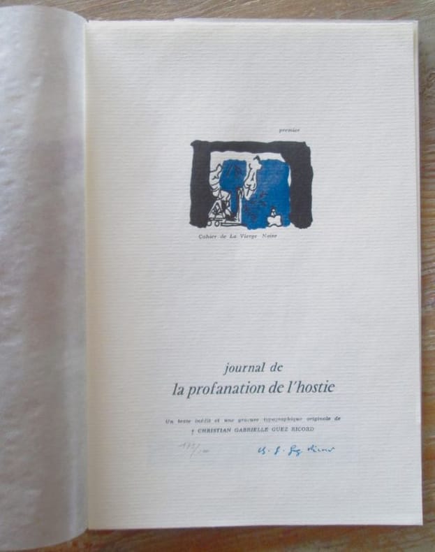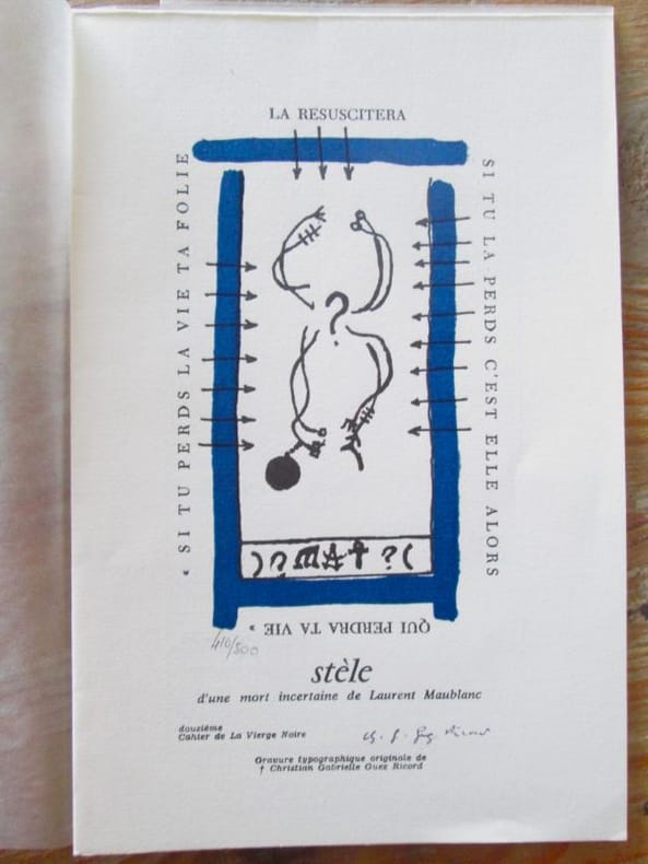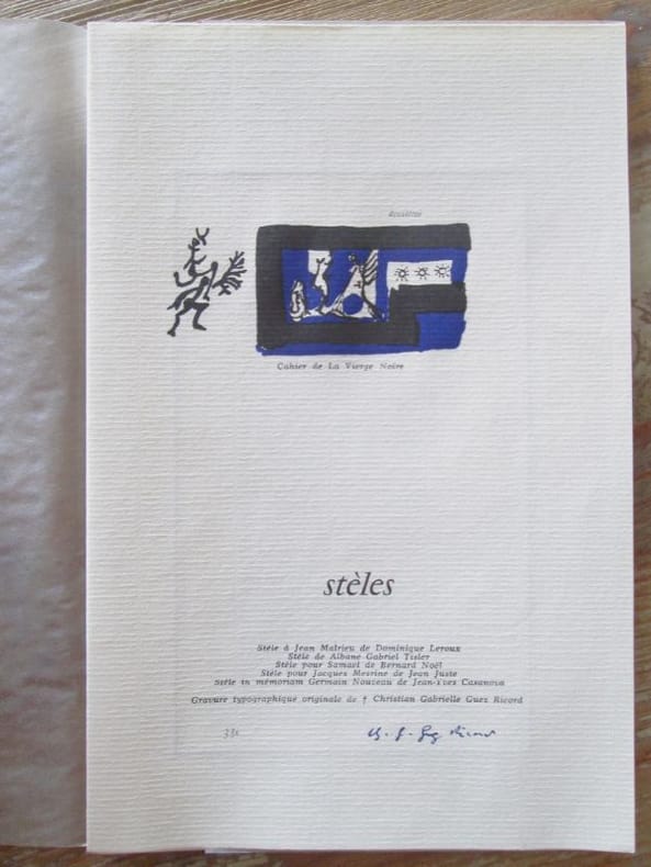 Gigondas :Atelier des Grames, 1980. Collection complète de 13 numéros, au format 23 x 15 cm, sous coffret cartonné et toilé. Tous les numéros sont tirés à 500 exemplaires numérotés sur vergé ivoire et signés par l'auteur, ornés d'une gravure typographique de Christian Gabrielle/Guez record. Premier cahier (1980): Journal de la profanation de l'hostie de Christian Gabriel Guez Ricord. Deuxième cahier (1980): Stèles de Dominique Leroux, Jean Juste, Bernard Noël, Albane Gabriel Tisler, Jean-Yves Casanova. Troisième cahier (1982): Stèles de François de Jassu, Léon-Gabriel Gros, Christian Gabriel Guez Ricord, Jean-Michel Alberola, Jean-Paul Guibbert. Quatrième cahier (1982): Stèles de Bernard Drujon, Jean Just, Jean-Gabriel Cosculluela, Christian Gabriel Guez Ricord, Jean-Yves Casanova. Cinquième cahier (1983): Stèles de Christian Gabriel Guez Ricord, François Boddaert, Christophe Munier, André Lauro, Hubert Birringer. Sixième cahier (1983): Stèles de Christian Gabriel Guez Ricord, Christian Dimanche, Dominique Sorrente, Laurent Maublanc. Septième cahier (1983): Stèles de Frantz Maugard, Christian Gabriel Guez Ricord, Nicolas Simon, Martine Simon .Huitième cahier (1983): Stèle depour Lenz de Isabelle Baladine Hovald. Neuvième cahier Le Havre àThéo Léger de François de Jassu...Dixième cahier de Francine Laigier. Onzième cahier de jean Juste, de Jean-Max Tixier, de Guez Ricord. Douzième cahier de Laurent Maublanc. Treizième cahier : L'Adieu de Christian Gabrielle Guez Ricord. L'auteur est « Né à Marseille, où il a vécu jusqu'à sa mort, Guez-Ricord incarne certainement le poète maudit de cette fin de siècle, à la croisée de Gérard de Nerval et Antonin Artaud". Très bel ensemble en excellent état. Complet.