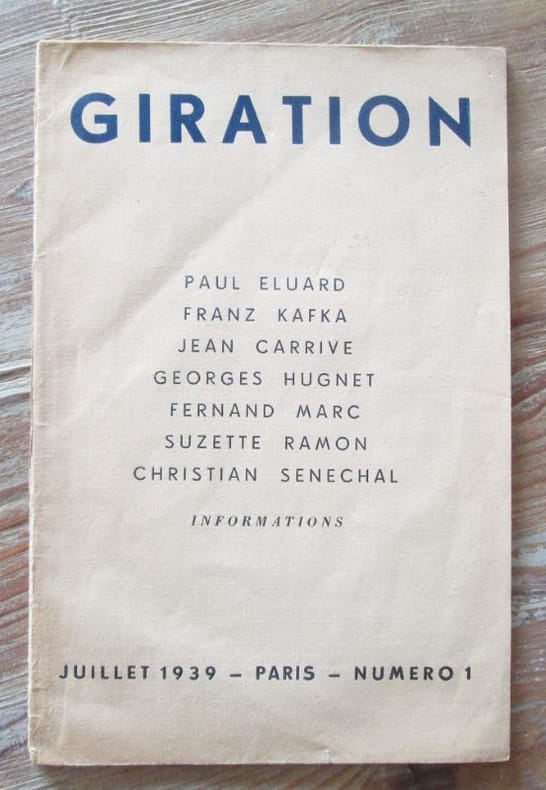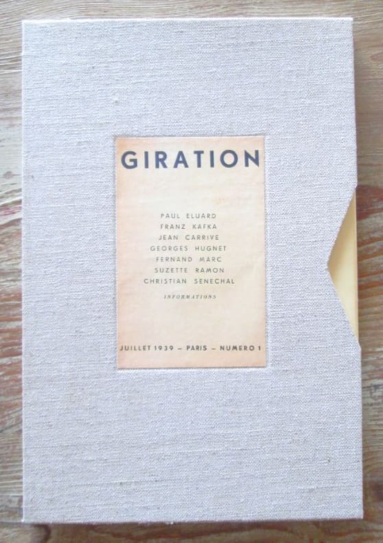 GIRATION. " Cahiers de poésie et d'information ". Paris (20, rue Montbrun). Directeur : Boris Daew. Un seul numéro paru, juillet 1939. In-8 broché, 20 pages. Textes de Paul ELUARD - Franz KAFKA - Jean CARRIVE - Georges HUGNET - Fernand MARC - Suzette RAMON - Christian SENECHAL.Sous chemise cartonnée et étui recouvert de pleine toile, vignette au centre du plat. Très bon état.