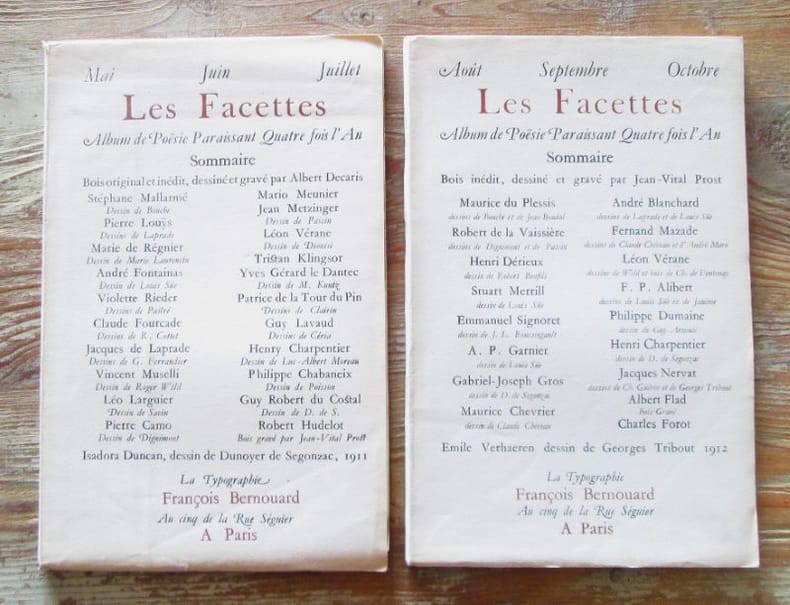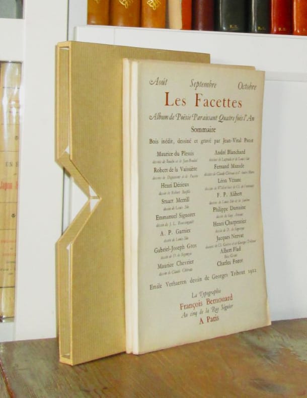 Paris, Typographie de François Bernouard, Mai-Juin-Juillet 1946, et Août - Septembre-Octobre 1946. Les deux derniers numéros de ce cahier trimestriel de poésie / directeur : Léon Vérane. In-8 brochés, sous étui, 60-40 p., Textes de Stéphane Mallarmé, Piette Louÿs, Léo Larguier, Pierre Camo, Léon Vérane, Tristan Kligsor; Le dantec, P. d ela Tour du Pin, Guy Lavaud, Maurice Chevrier, Jacques Nervat etc. Nombreux dessins in et hors texte en noir, de Bouche, Laprade, Marie laurencin, Dignimont, Pascin, L. A. Moreau, Robert Bonfils, Claude Chéreau, Segonzac, et bois gravés par Jean-Vital Prost et Albert Decaris. Très bel exemplaire. Rare.